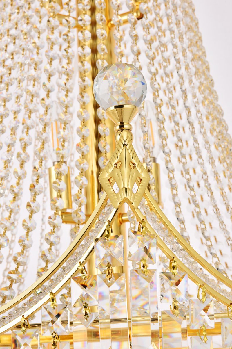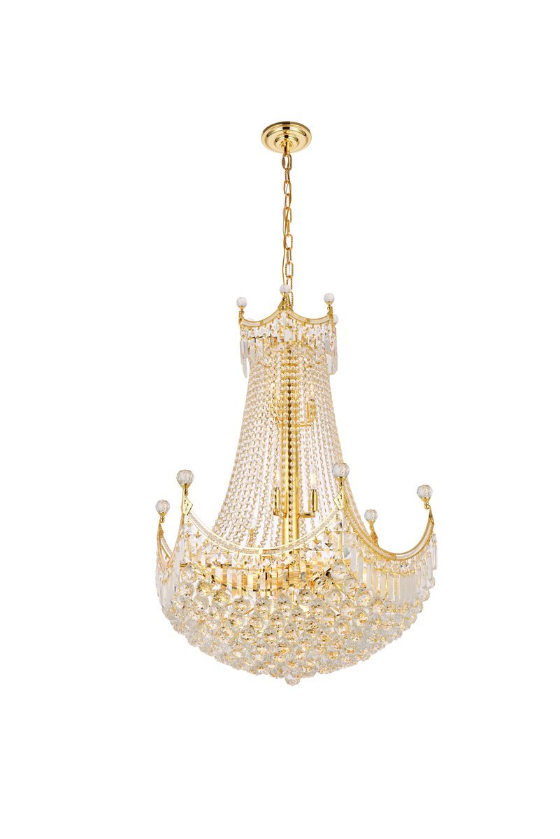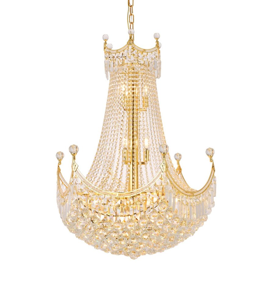 An empire-style chandelier brimming with sparkle, Corona collection hanging fixtures fill a home with brilliant light. The base of the frame forms a hemisphere that is overflowing with clear crystal balls and faceted prisms and tipped with matching crystal balls. Draped crystal octagon strands dangle along the body of the lamp while a gorgeous crystal "crown" matches the edges of the frame, completing the look and giving the design its name. Available in one, two, or three glorious tiers a chrome or gold finish that is dazzling in a dining room, stairwell, or living room.