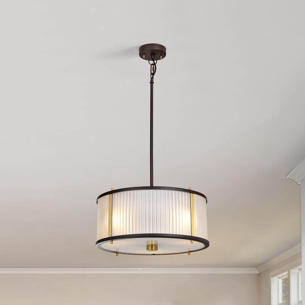 Corona: a versatile glass pendant, semi-flush, or flush light. Frosted side panels subtly diffuse light, and a large opal white diffuser creates a clean, illuminated space. Finished in Museum Bronze.