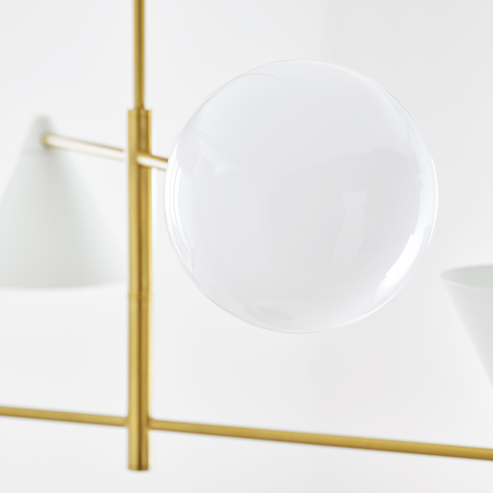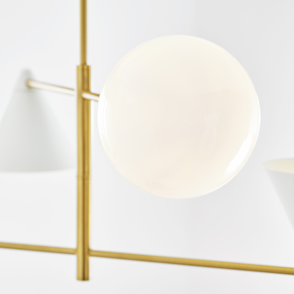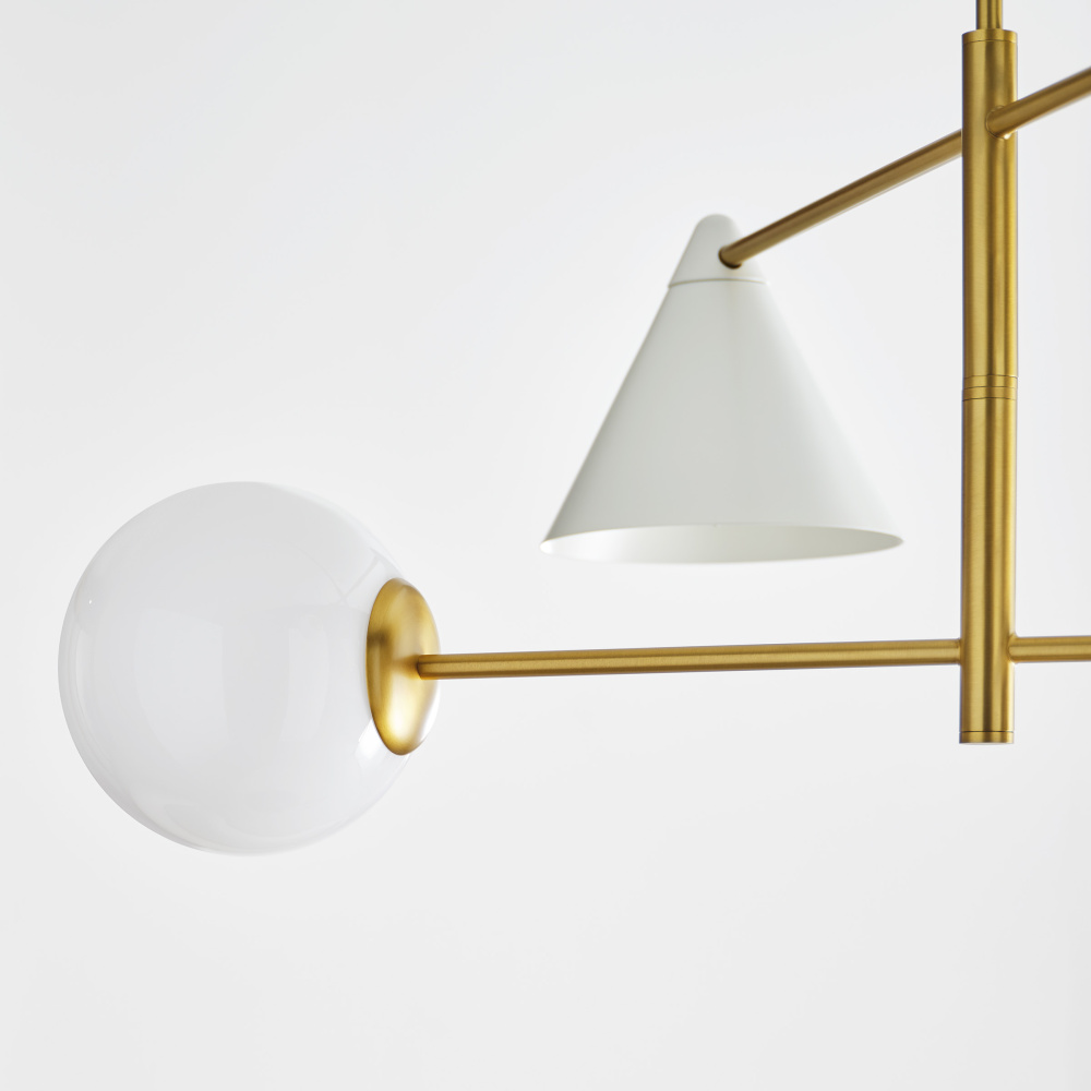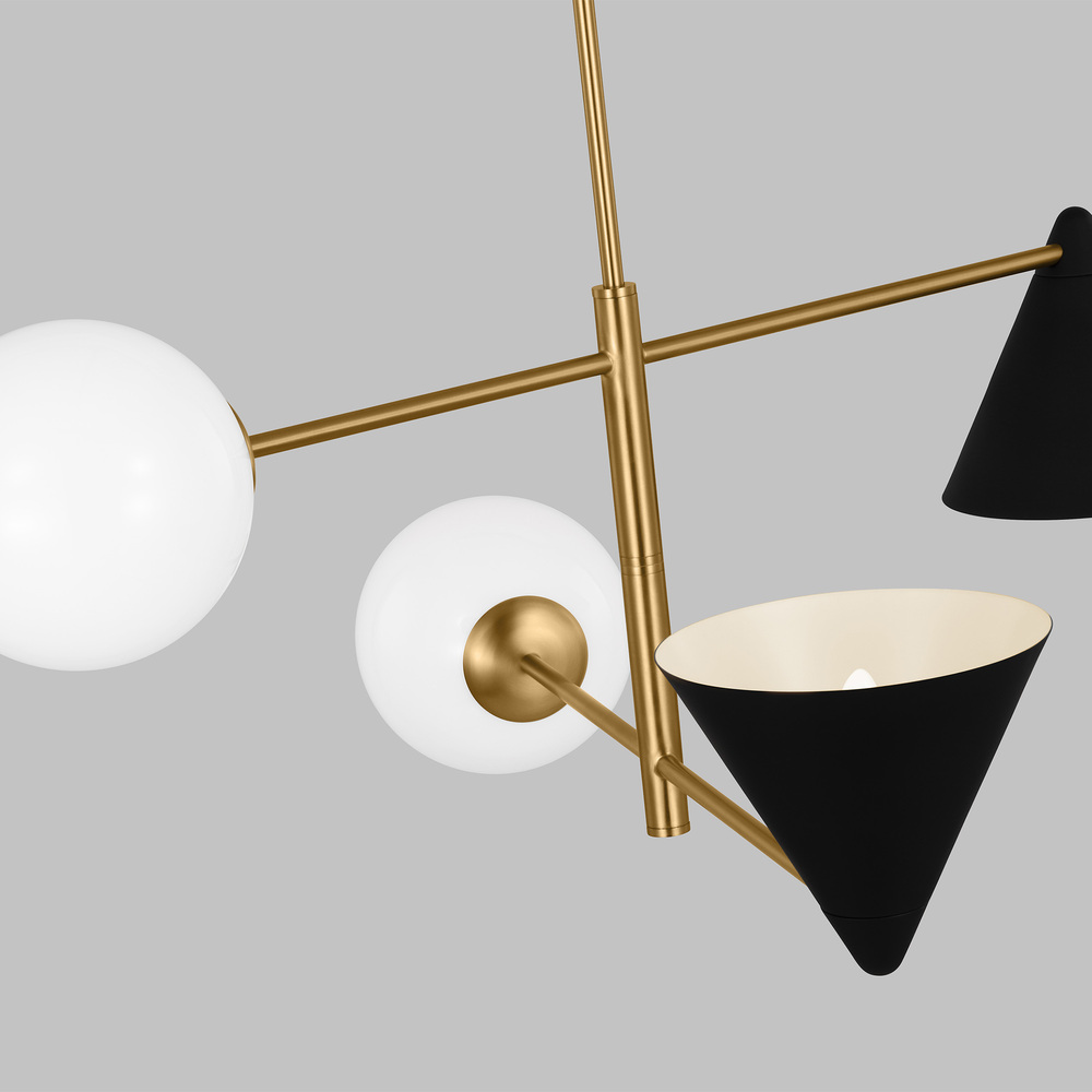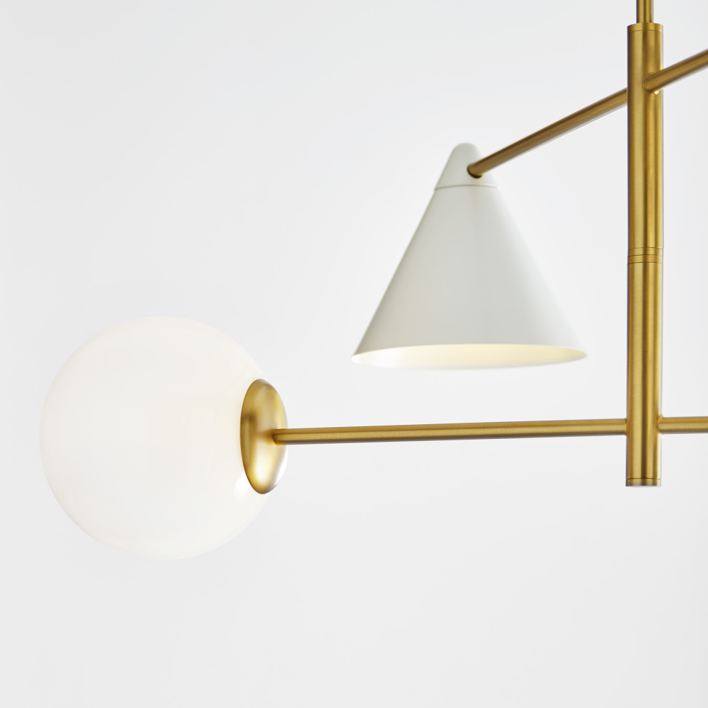 The Cosmo series by AERIN for Visual Comfort Studio Collection plays with asymmetry, combining milk glass globes that emit a soft glow, and metal cone shades, which focus light above and below.