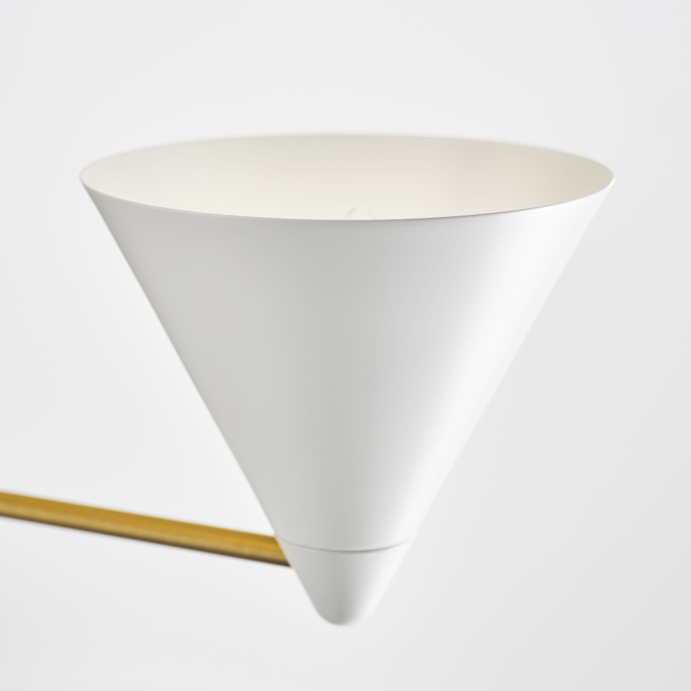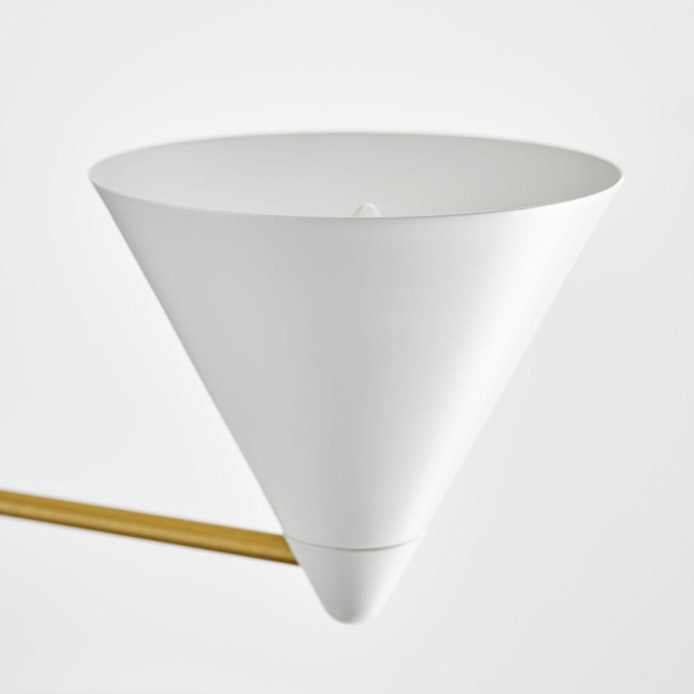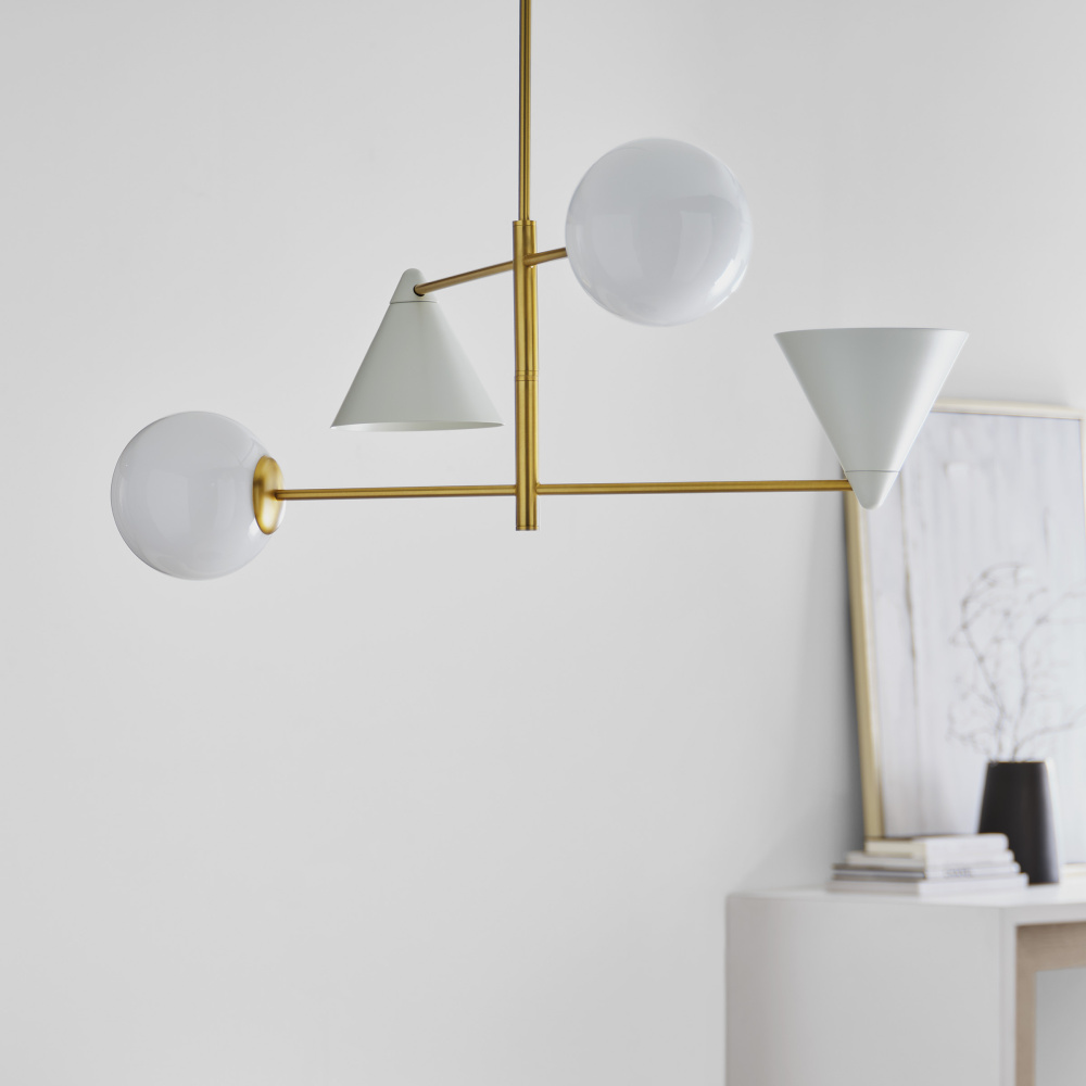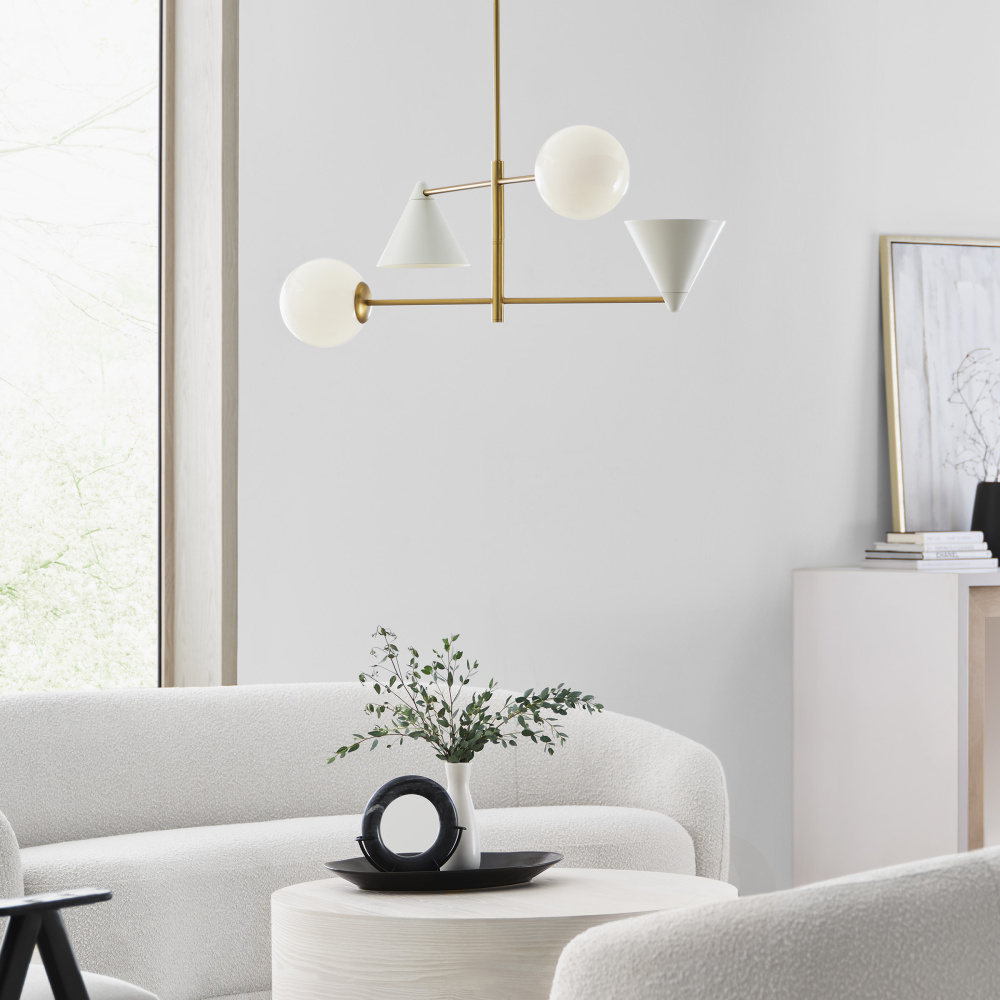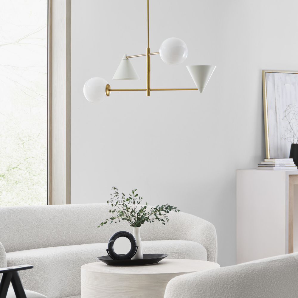 The Cosmo series by AERIN for Visual Comfort Studio Collection plays with asymmetry, combining milk glass globes that emit a soft glow, and metal cone shades, which focus light above and below.