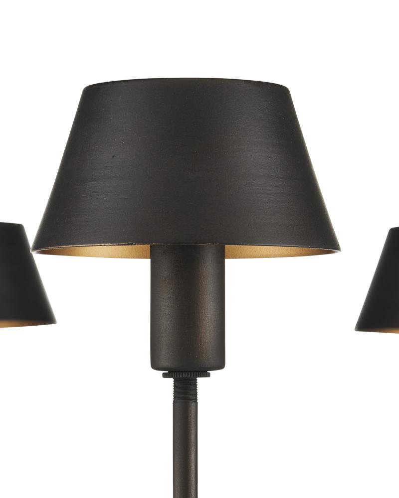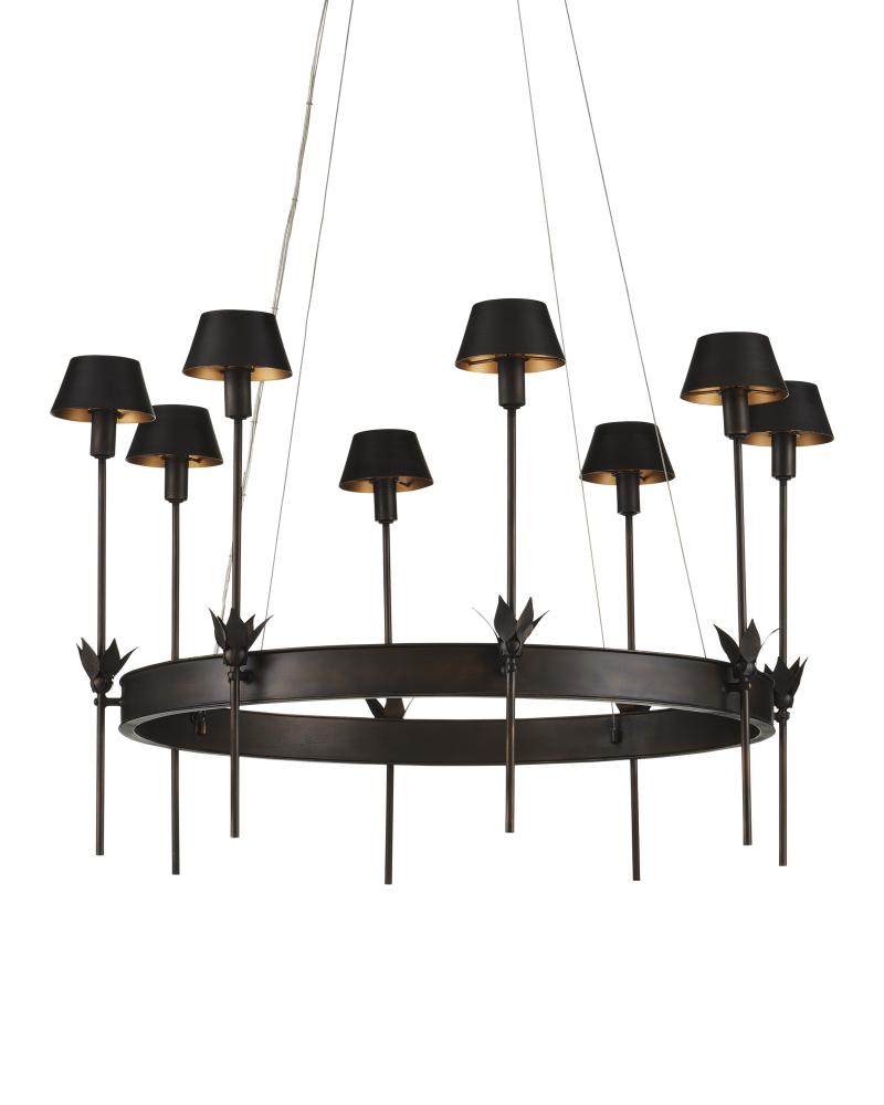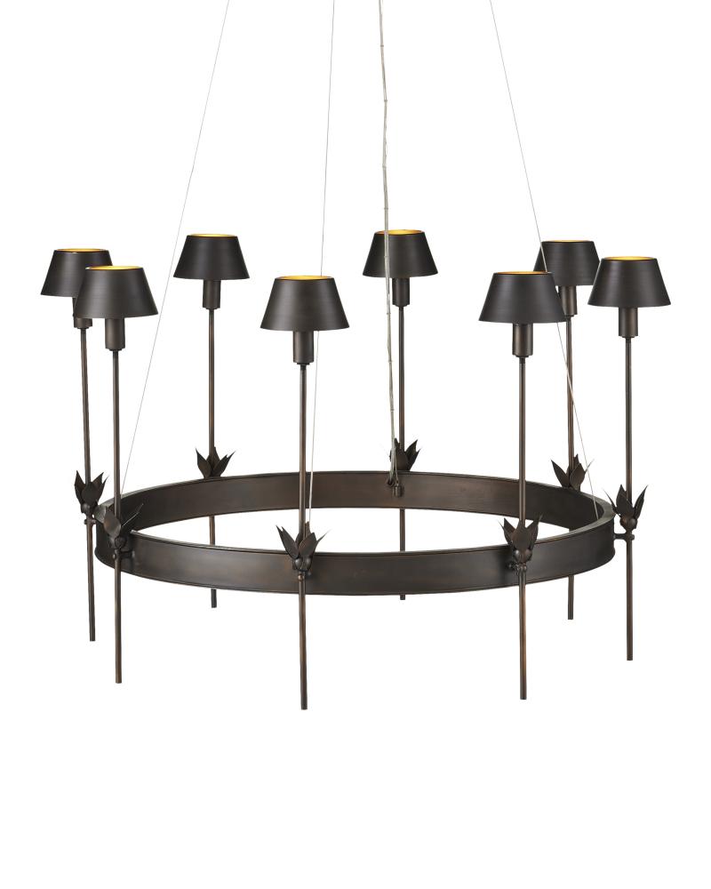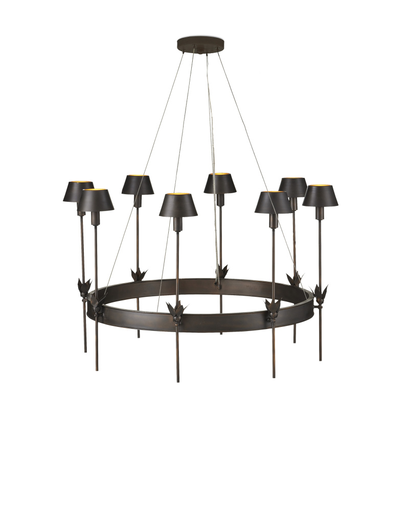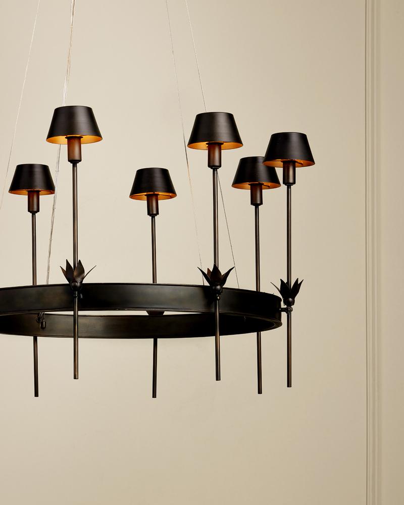 The Coterie Bronze Chandelier is crafted from wrought iron in a bronze finish, with a contemporary gold finish on the interior of the shades to enhance the warmth of the illumination. Designed to embody elegance and innovative technology, the fixture features tall, slender arms, small-scale shades, and aircraft cables for suspension. The innovation lies in the specially selected LED bulbs, which are included with the chandelier. A standout detail is the refined design of the large ring, accented with rims that extend both inward and outward for a sophisticated touch. Adjustable from 27" to 146" with use of included chain/rod kit/cable. If your space calls for a longer drop, additional chain/rods/cable is available for purchase.