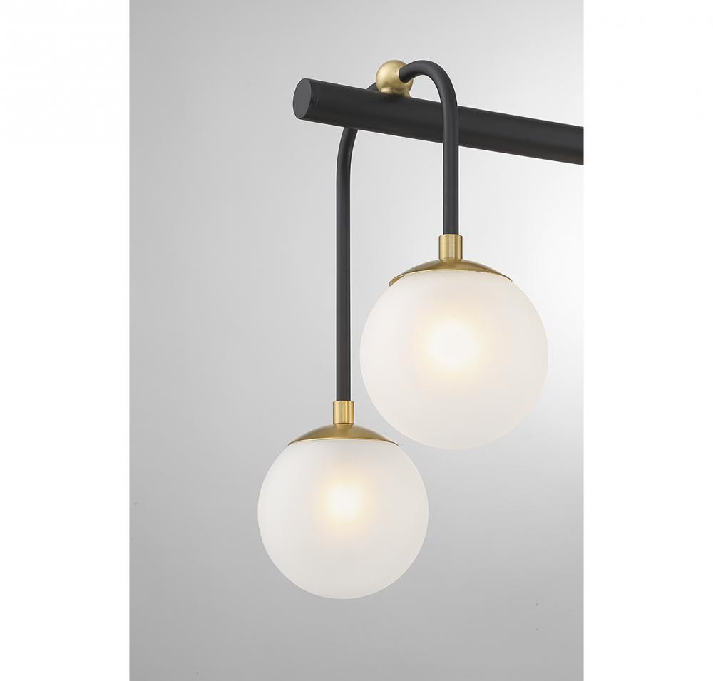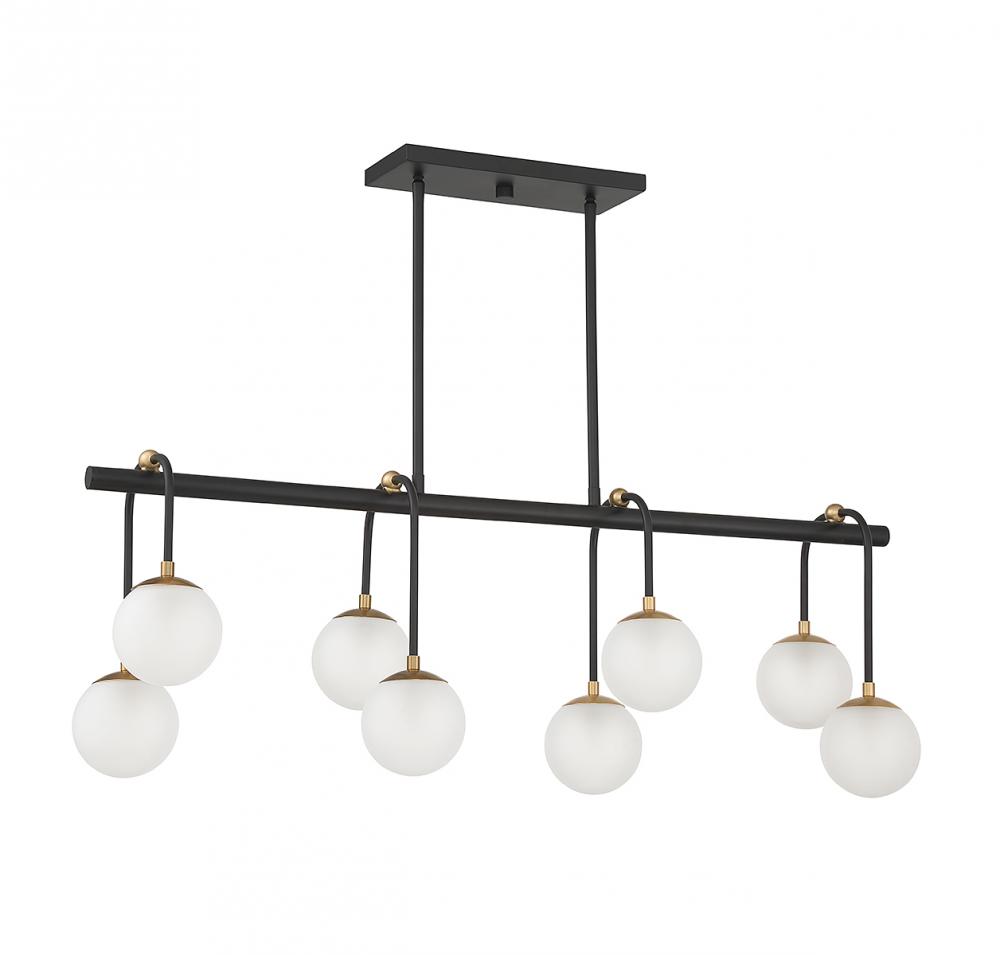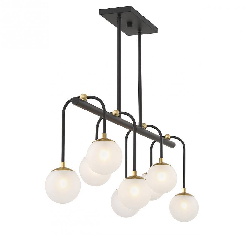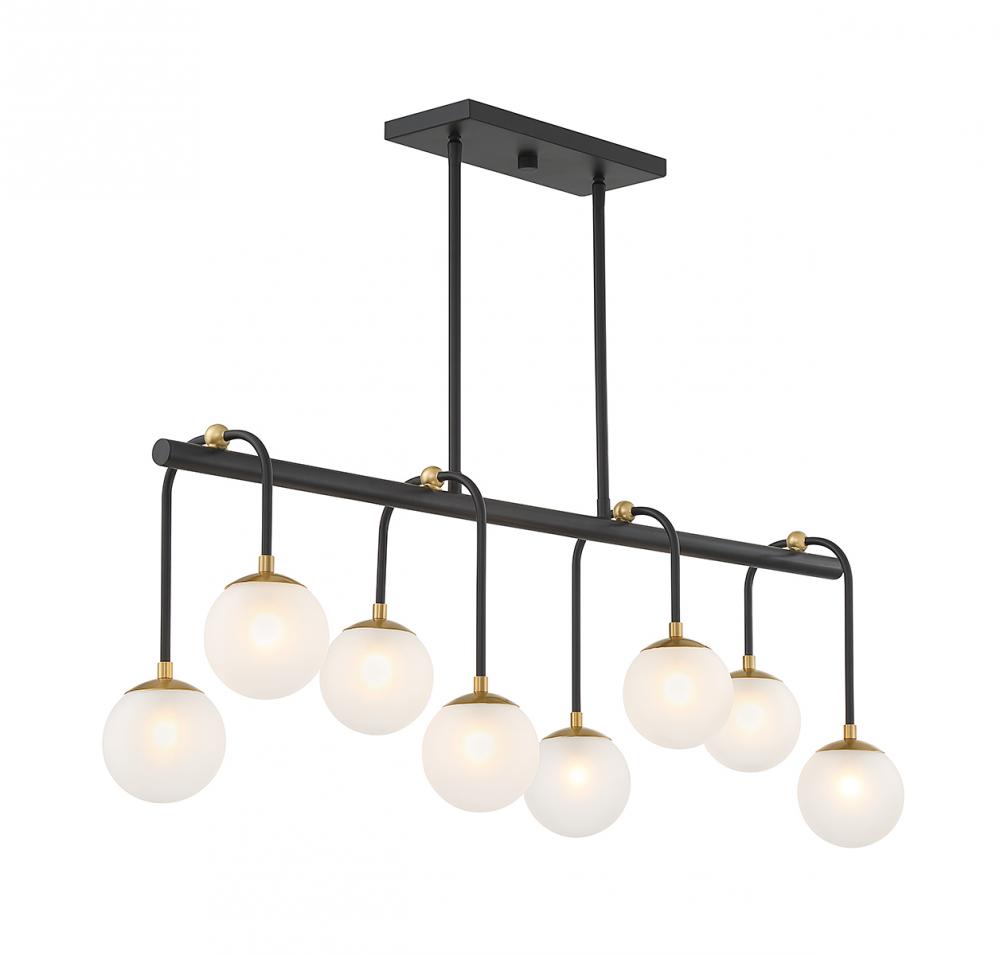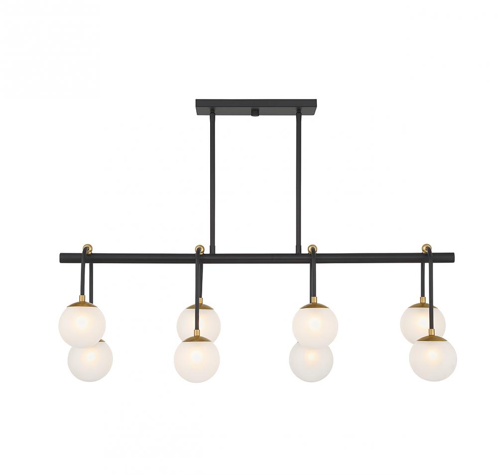 The midcentury-inspired Savoy House Couplet 8-light trestle is like a waterfall of style featuring curved branching arms topped with orbs of sanded glass. Finished in matte black with warm brass accents. Couplet is 38" in length, 10" in width and has an adjustable height ranging from 13.5" to 67". Comes with eight 12" downrods and two 6" downrods.