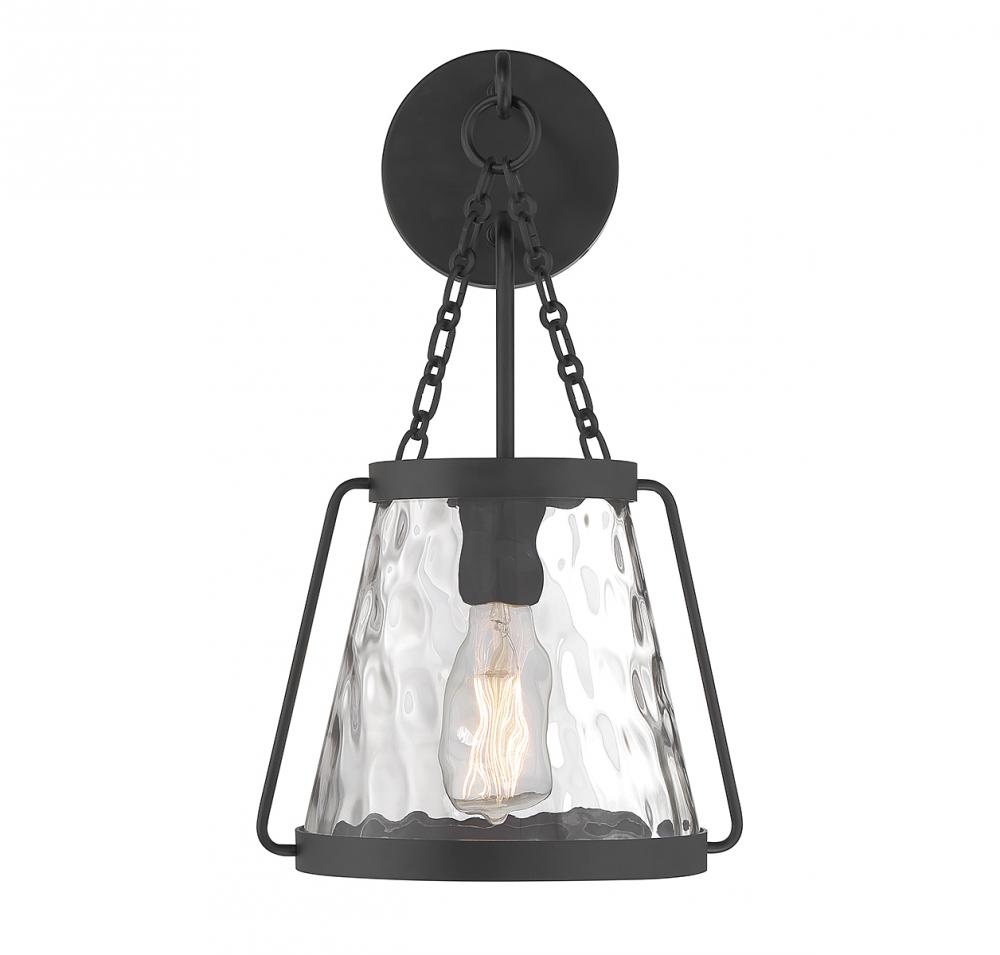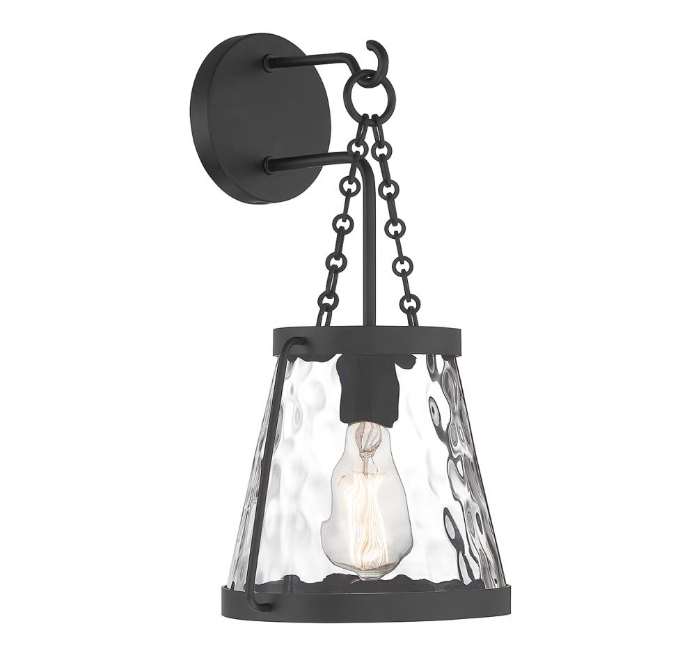 The Savoy House Crawford 1-light wall sconce proves that a classic style can be stunning! A lantern-inspired shade of clear water glass hangs down from an understated structure with industrial-inspired details. Finished in matte black. Crawford is 17.25" in height, 10" in width and extends 9.25" from the wall. It uses 1 standard size bulb with a max of 60 watts (bulb not included).