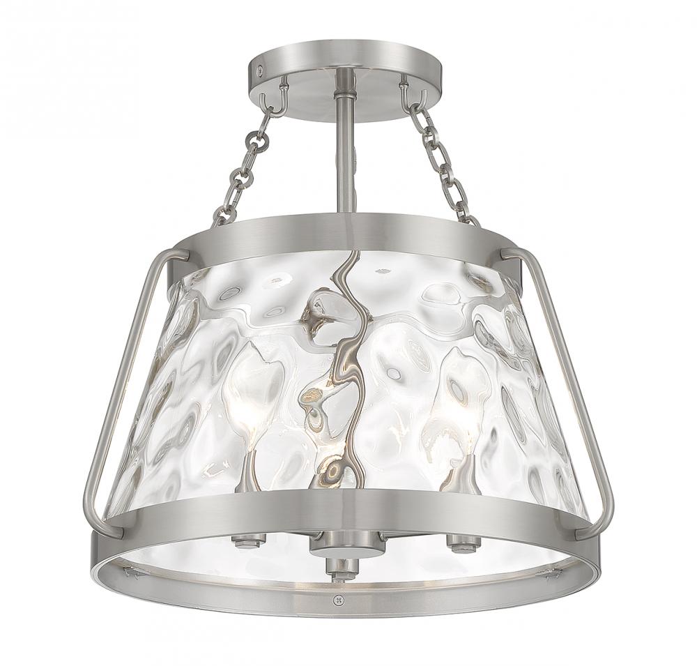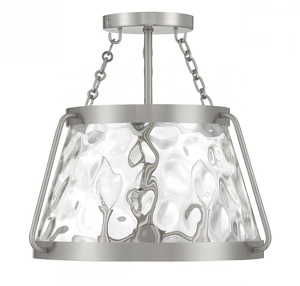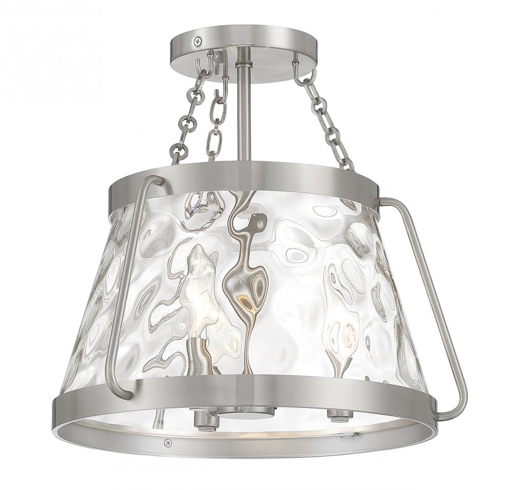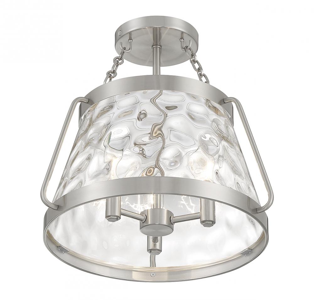 The Savoy House Crawford 3-light ceiling semi-flush mount proves that a classic style can be stunning! A lantern-inspired shade of clear water glass hangs down from an understated structure with industrial-inspired details. Finished in satin nickel. Crawford is 13.50” in height and 15” in width. It uses 3 candelabra size bulbs of up to 60 watts per bulb (bulbs not included).