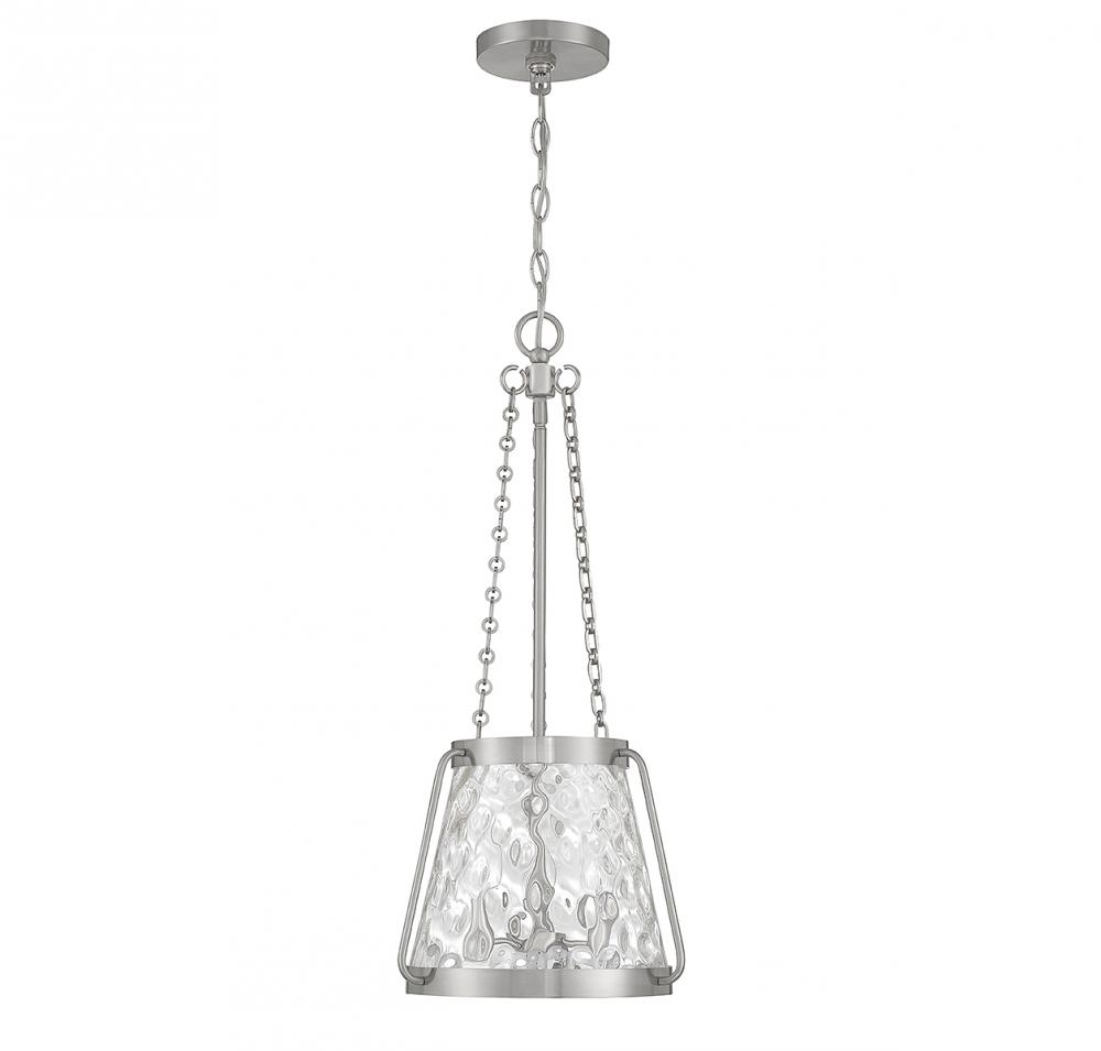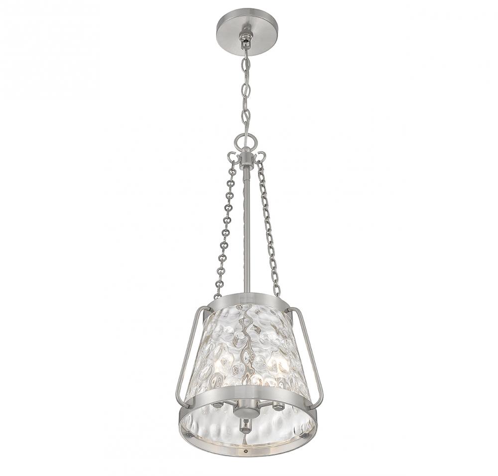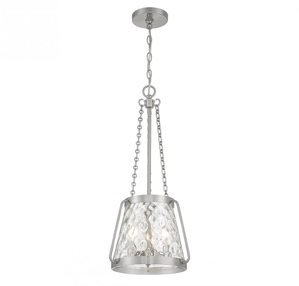 The Savoy House Crawford 3-light pendant proves that a classic style can be stunning! A lantern-inspired shade of clear water glass hangs down from an understated structure with industrial-inspired details. Finished in satin nickel. Crawford is 25.5” in height and 12” in width. It uses 3 candelabra size bulbs of up to 60 watts per bulb (bulbs not included).