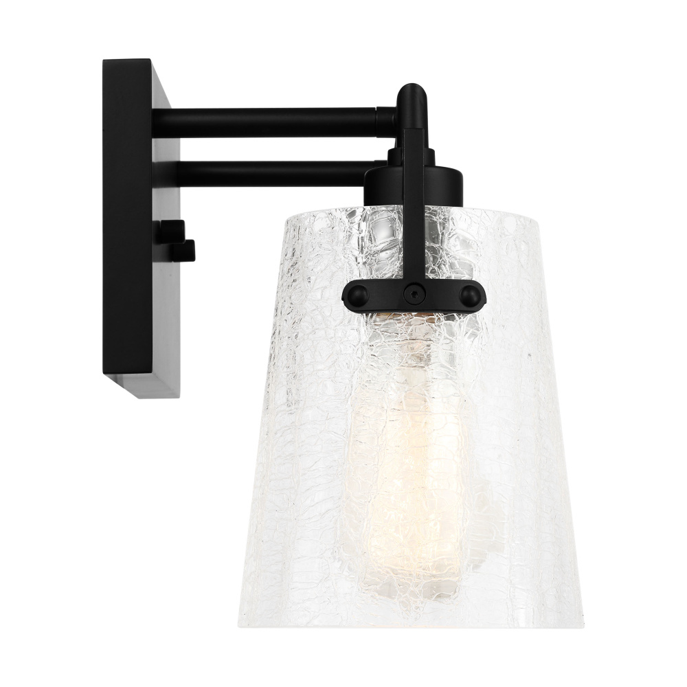 Add a bright burst of light where you need it most with the stylish Drew & Jonathan Crofton wall light, featuring a sleek rectangular metal backplate and crackle clear glass shade. Made to coordinate across a broader range of bath hardware and design styles, the Crofton is available in four popular finishes, Brushed Steel, Chrome, Midnight Black, and Satin Brass. This light looks great on its own or installed above a bathroom vanity, and the glass shade makes it ideal for filament bulbs. This fixture may be mounted in the up or down position, and is cETL listed for damp locations, making it the perfect lighting solution for any space.