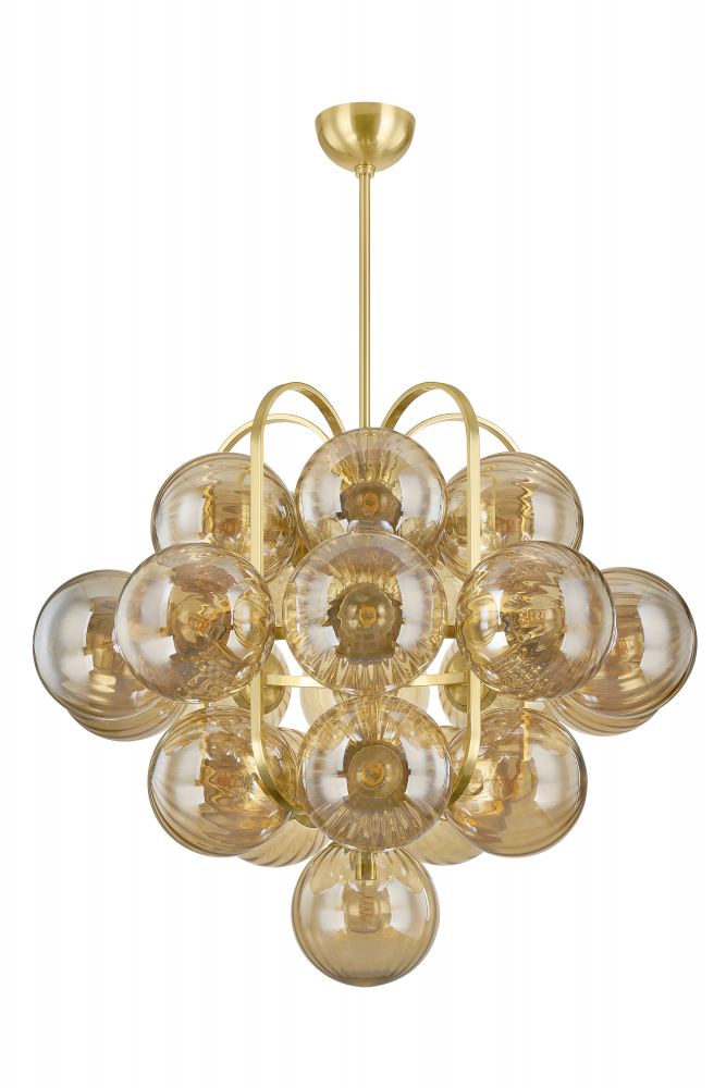 Like grapes on a vine, a cluster of glass orbs perch along the antique-inspired frame of Cronus. The ribbed, light bronze glass emits a warm glow, complemented by gleaming Vintage Polished Brass arches. Available as a 1-light wall sconce or 12 or 21-light chandelier, Cronus infuses a living or dining space with old Hollywood glamor.