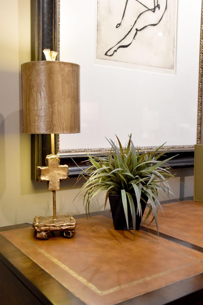 A 23" table accent lamp in antique gold with a cross-patterned pedestal base and gold drum shade. It uses a 60W bulb (not included) and a tassel finial, adding vintage glamour to any space.