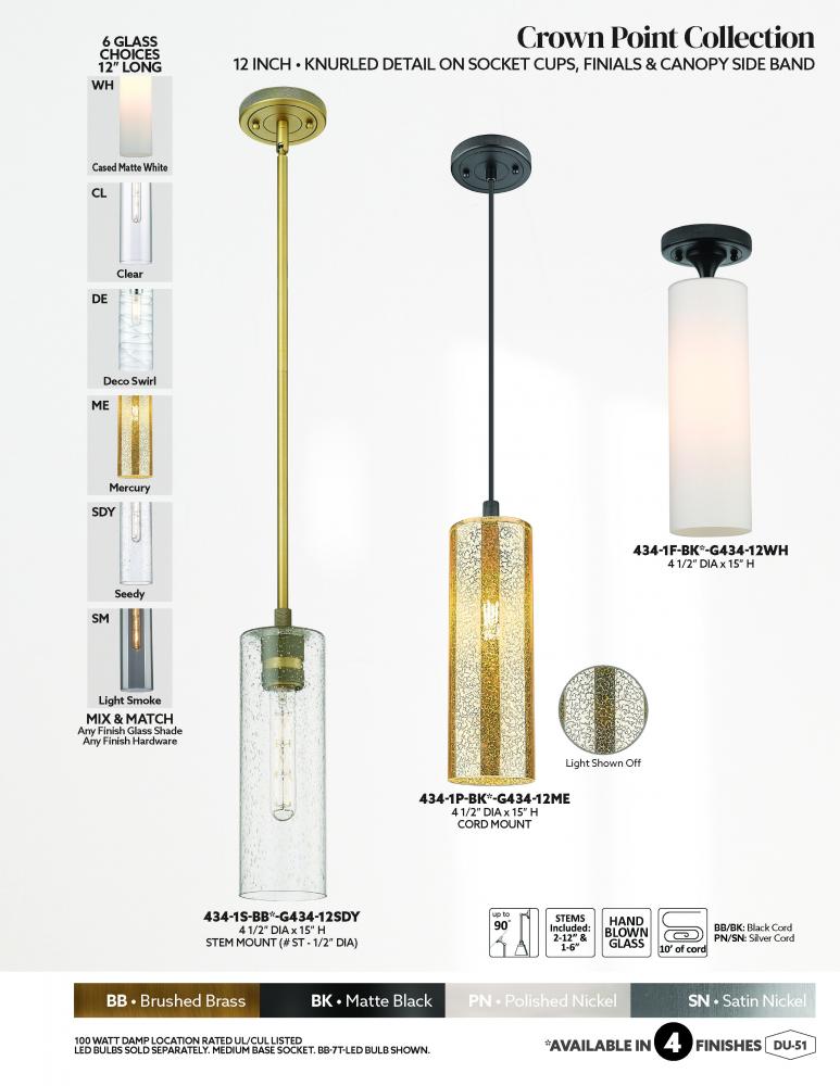Details abound in the Crown Point Collection with an industrial take on modern sophistication. This stunning line of fixtures features cylindrical glass set in an updated restoration style frame with intricate knurling detail on the sockets, canopy, and fi