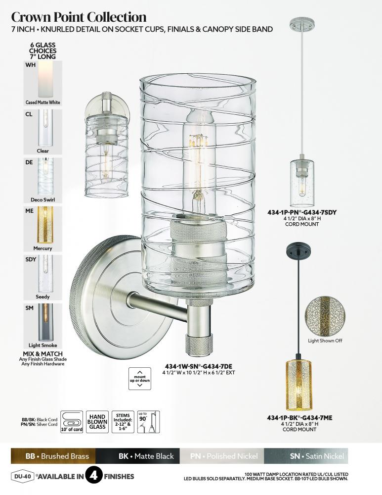 Details abound in the Crown Point Collection with an industrial take on modern sophistication. This stunning line of fixtures features cylindrical glass set in an updated restoration style frame with intricate knurling detail on the sockets, canopy, and fi