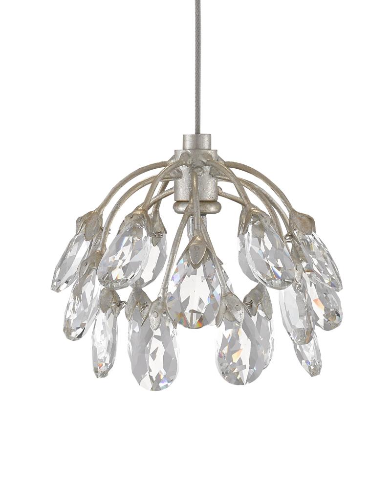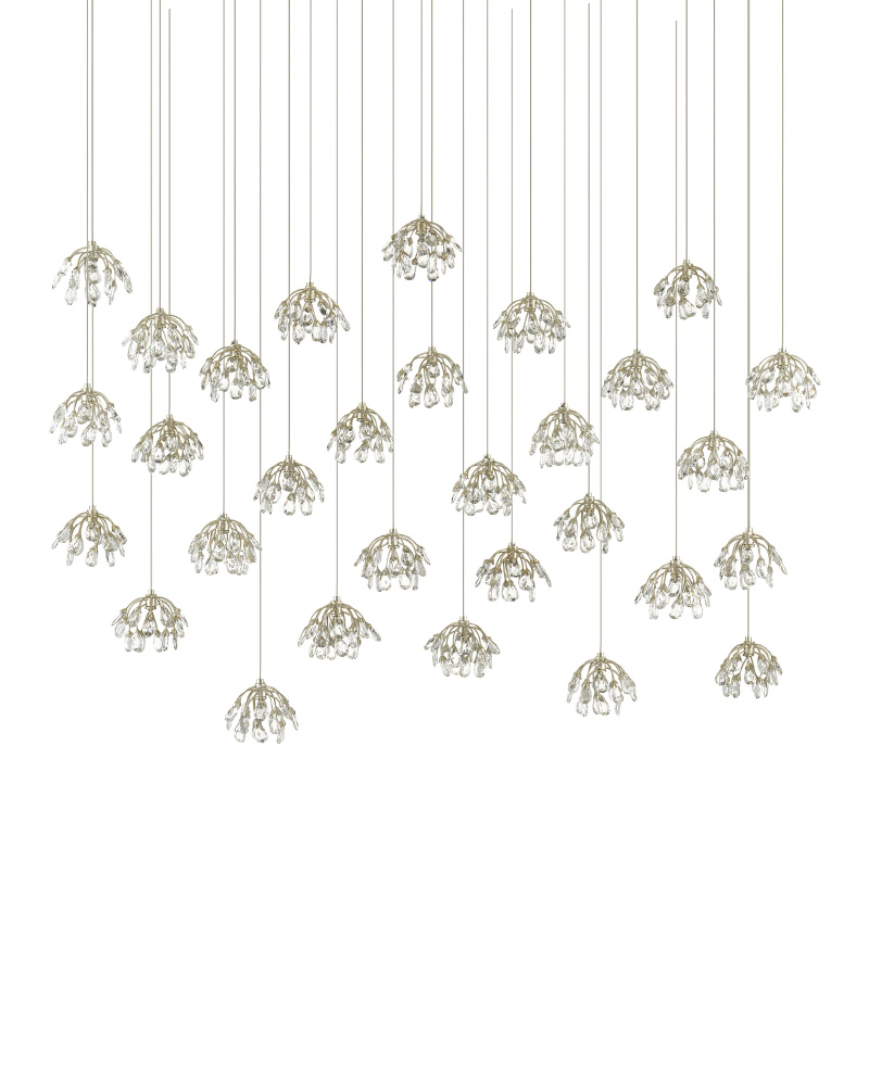 The Crystal Bud 30-Light Multi-Drop Pendant dangles flowers made of delicate faceted crystals from its canopy to make the shades effervescent and graceful. The canopy of this piece is luminous in a painted silver finish. This fixture is among Currey & Company's multi-drop pendant collection, which includes multiple configurations.