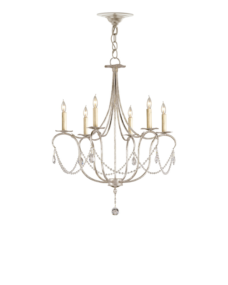 The small version of our Crystal Lights Chandelier flaunts its jewelry fittingly, as its beads are far from mere ornamentation: they are essential to the heart of this design. The crystals swag between elegant wrought-iron spokes that curl daintily at the ends. Wires bind the curling supports to those cascading from the canopy for added cohesion in the design details, all treated to a silver leaf finish. We see the fixture with its six candelabra bulbs as the perfect bauble for the bewitching boudoir.