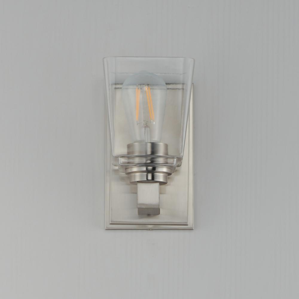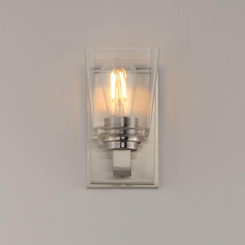 A composition of square forms that feature a Clear tapered square glass shade, these bath vanities provide a transitional design that suits both modern and traditional spaces. Available in Matte Black, Polished Chrome, Satin Nickel, and Natural Aged Brass.