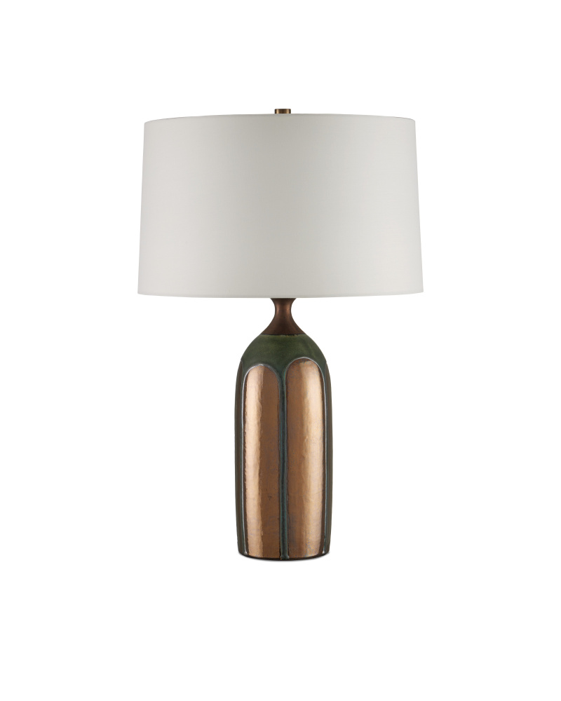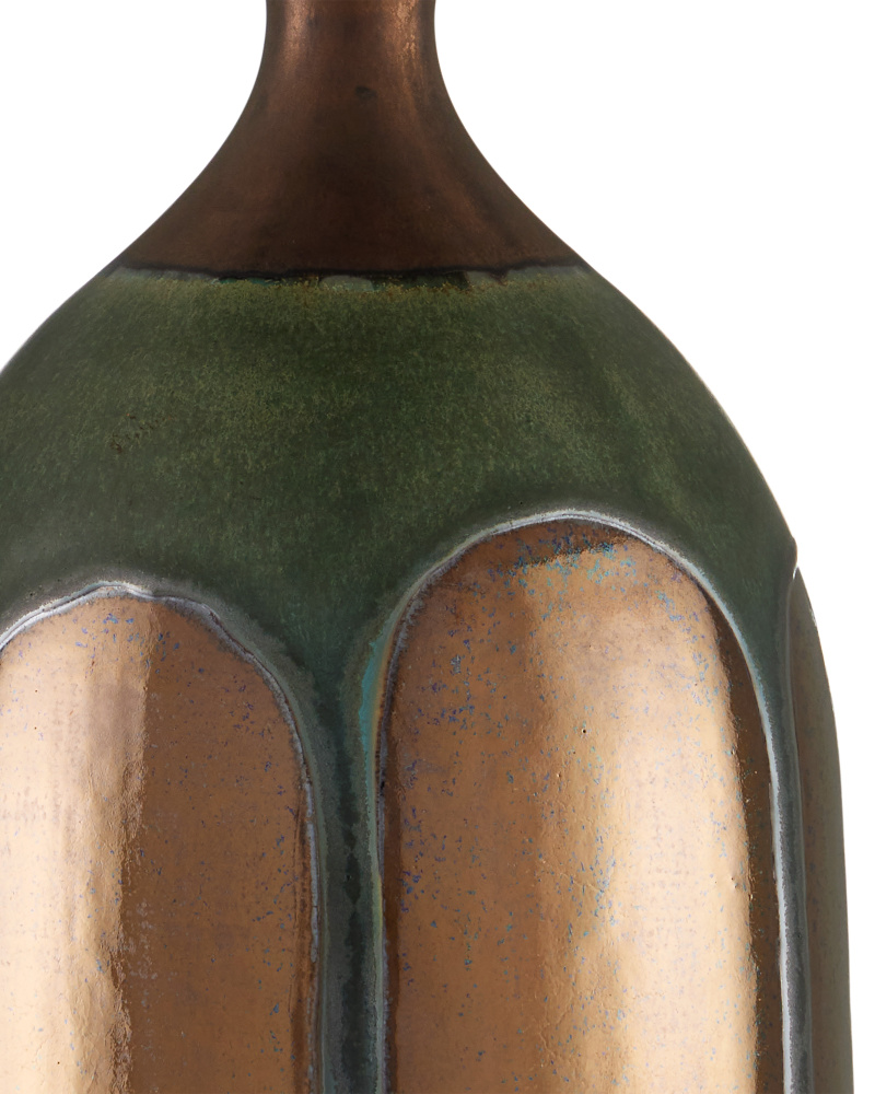 Dripping with artistic appeal, the Cuprum Table Lamp earns its name from the copper glaze that enlivens its bottle-shaped surface. Trickling down from the point where the ceramic lamp’s body begins to swell, a dark green glaze flows toward the bottom where it ends in runnels that expand in a painterly fashion.
