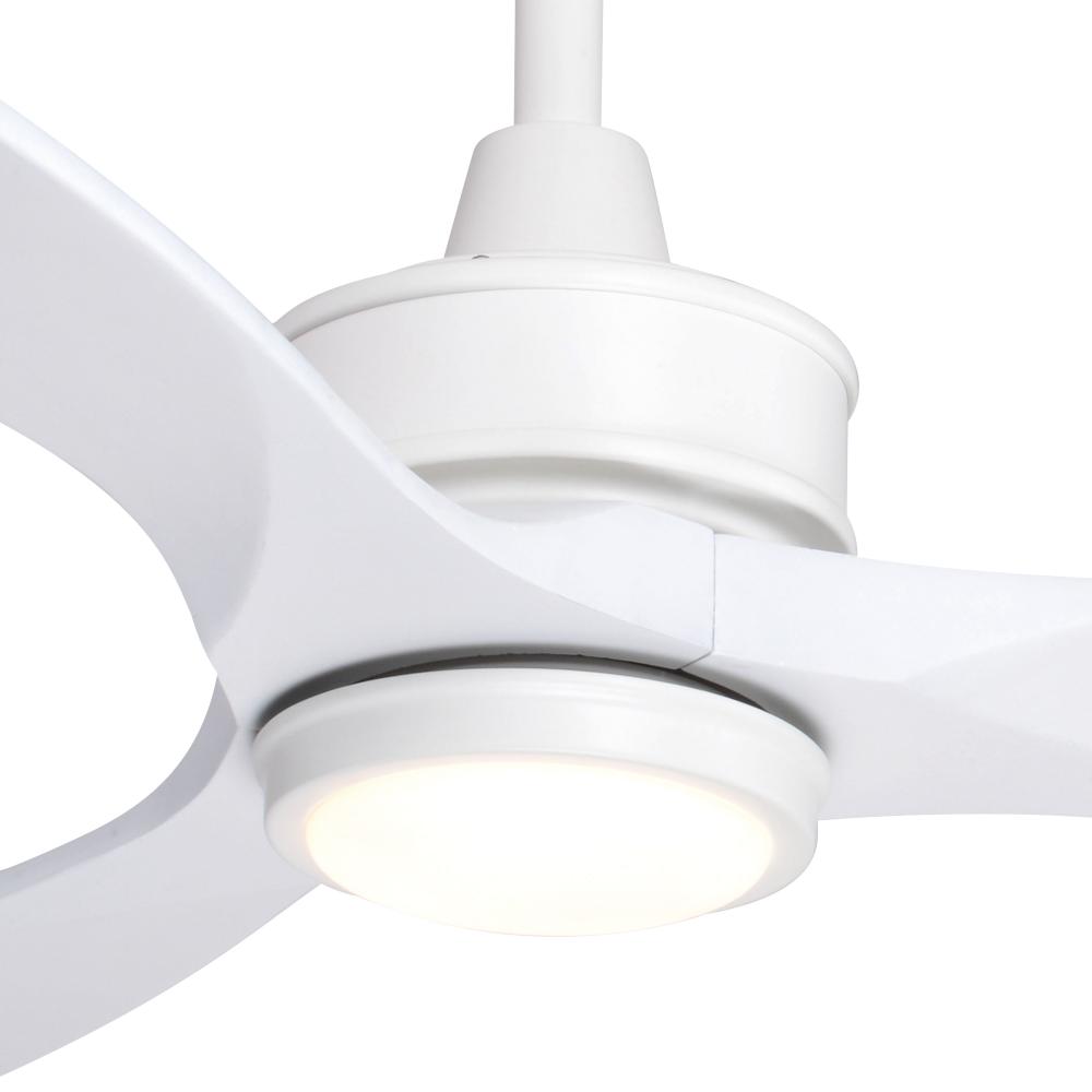 The white on white finish, hand carved solid wood blades, and clean lines give the Curtiss ceiling fan its on-trend contemporary look. This fan is compatible with sloped ceilings and includes a 6 inch downrod (longer down rods sold separately). Exterior damp rated, ideal for indoor or outdoor spaces such as entryway, family room, bedroom, bathroom, living room, kitchen, or covered outdoor porches. Remote control included for added convenience. An integrated LED light kit provides energy savings, low maintenance and long-lasting performance.