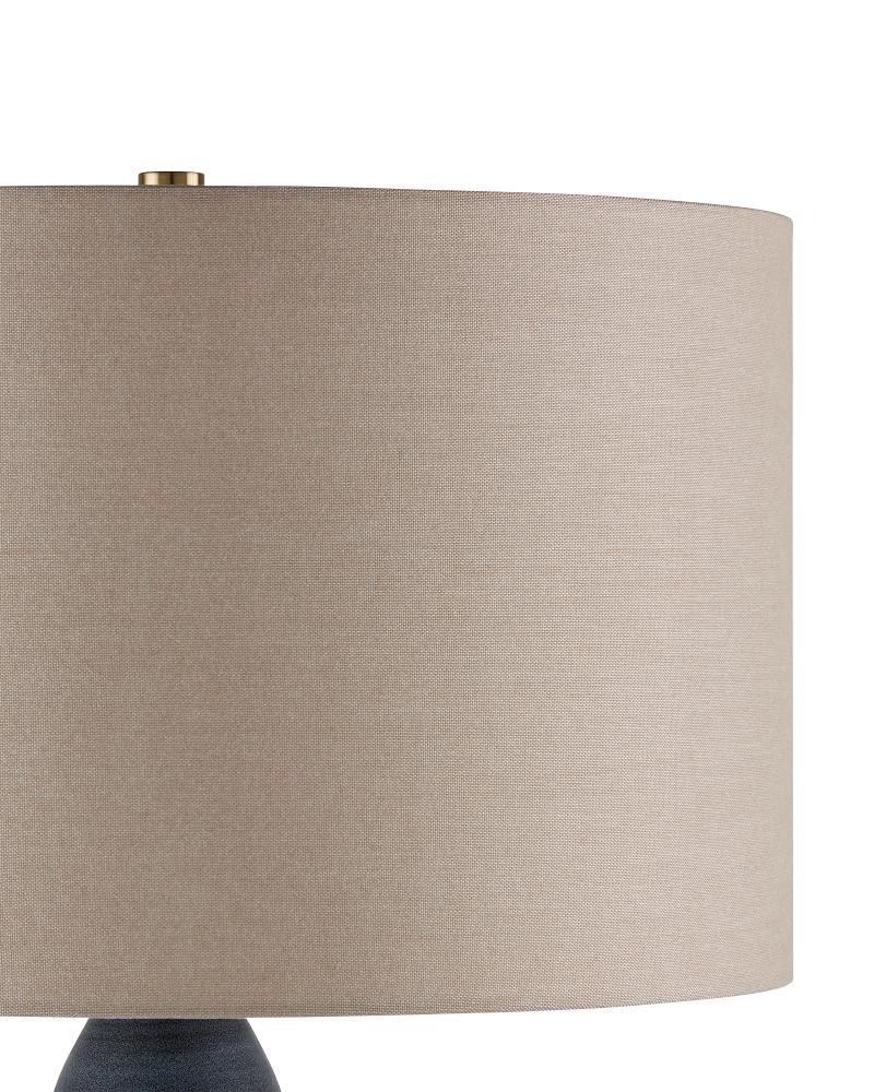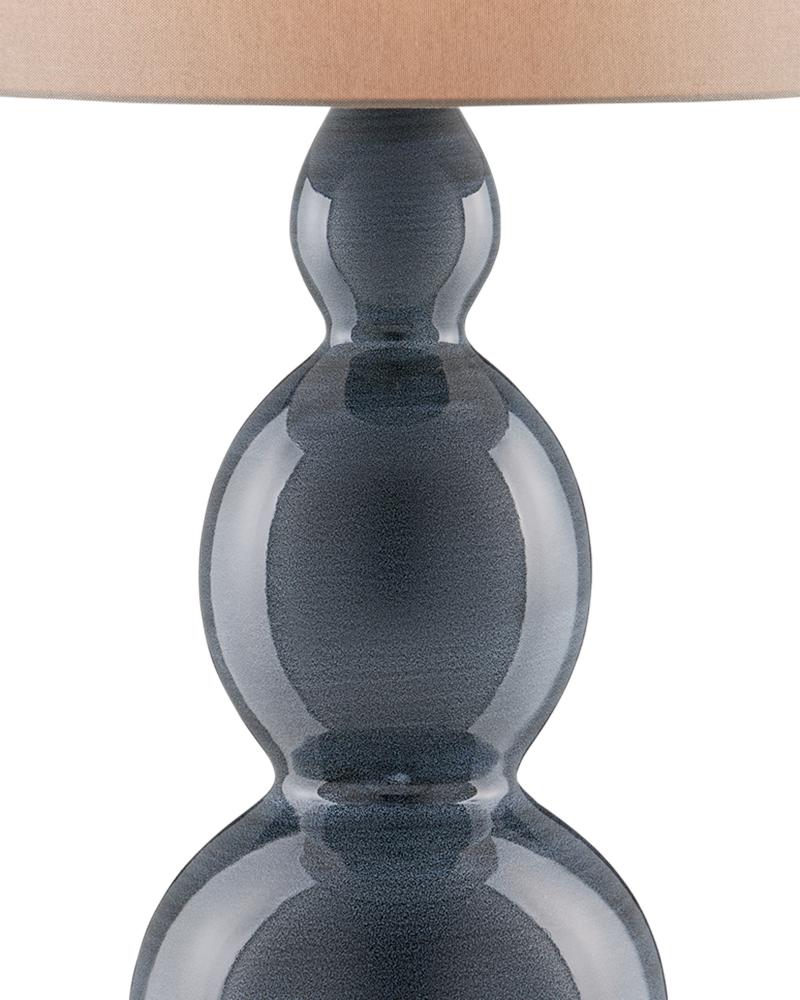 The Cymbeline Table Lamp has a triple-gourd shape with a surface that shines. The body of the lamp has a gray glazing that is stippled so delicately, it reads as one hue. The gray table lamp is topped with a natural linen shade and stands on a brass square base.