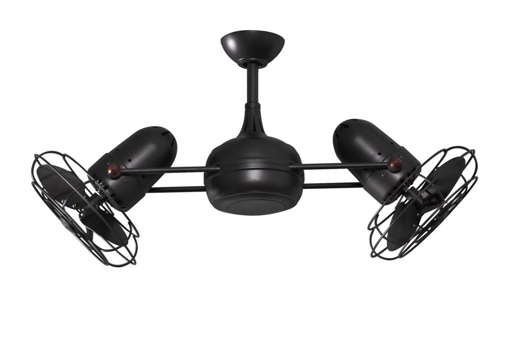 The double-headed rotational fan, Dagny, with cylindrical central housing and straight, parallel arms, is designed in the retrospective aesthetic. The Dagny offers fluid lines and quiet axial rotation. The fan heads can be infinitely positioned in 180-degree arcs for optimum air movement; the greater the angles of the motors to the horizontal support rods (up or down), the faster the axial rotation. A slow, controlled axial rotation is achieved by both fan head position and fan blade speed. Matthews rotational fans circulate heat and air-conditioning more efficiently than traditional paddle fans.