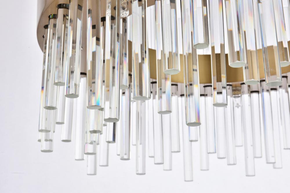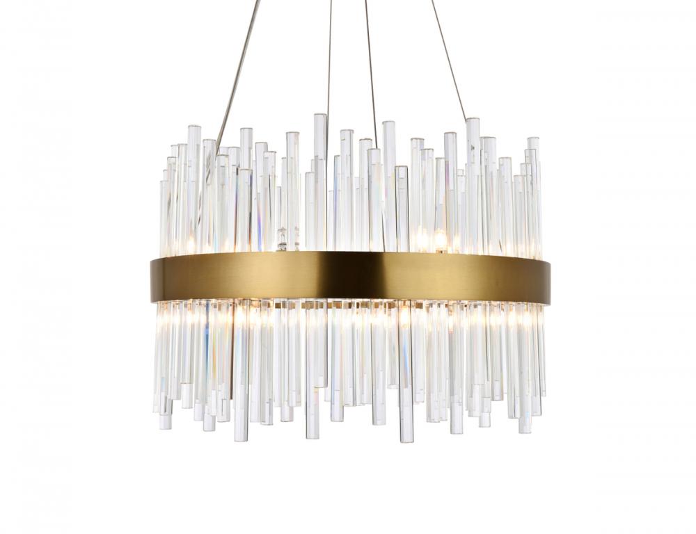 This stately fixture combines timeless elegance with modern and attractive sophistication. The delicate juxtaposition of upright and hanging clear glass rods creates a truly stunning visual statement, seamlessly woven together within a sleek gold frame. This expressive piece would be a welcomed and treasured addition to a wide range of contemporary residential styles.