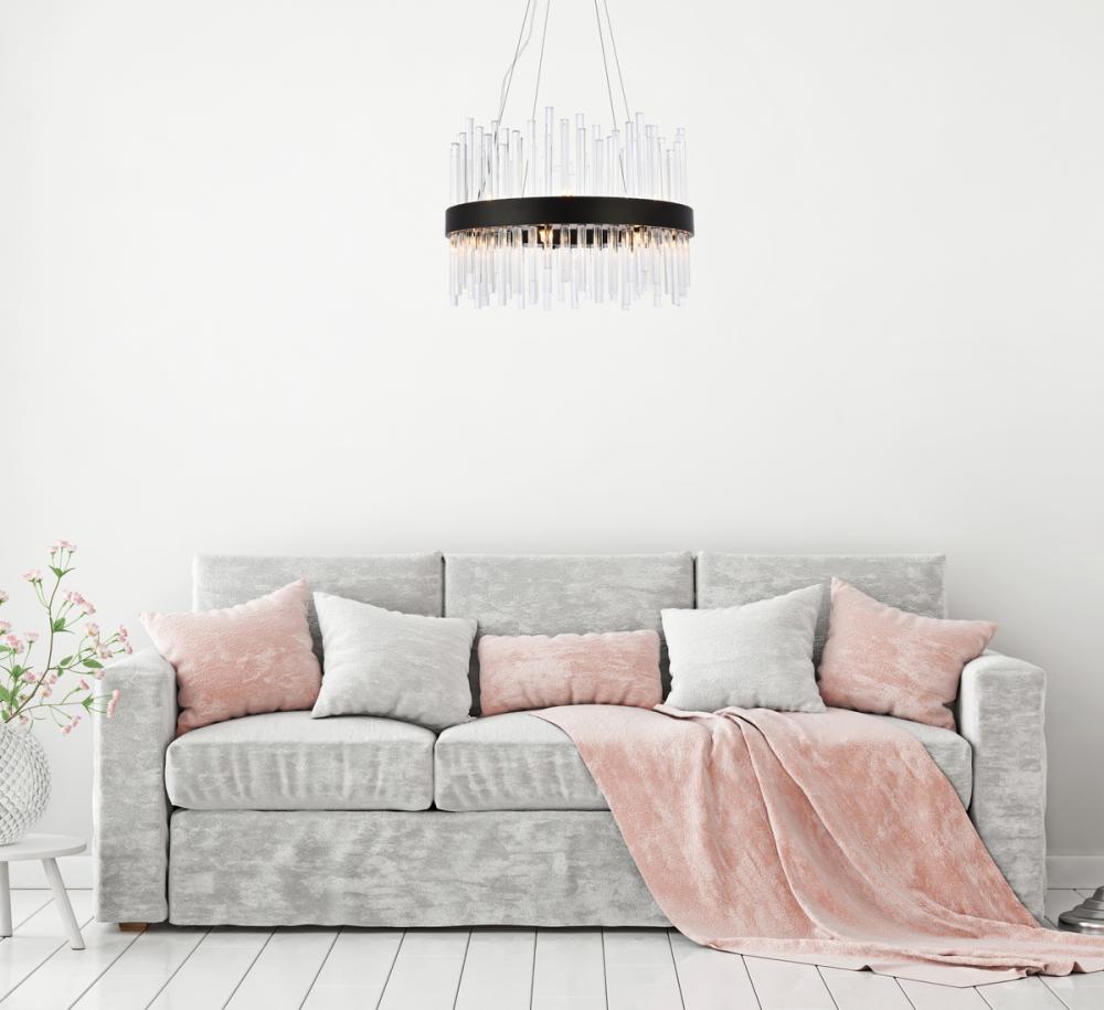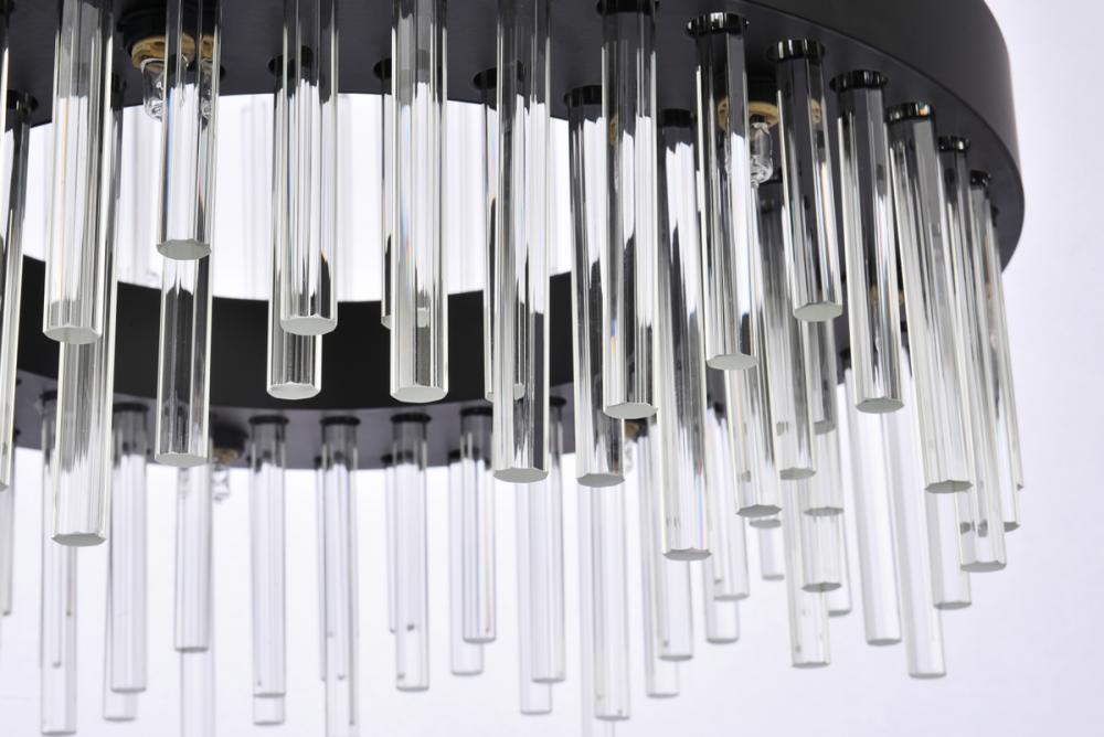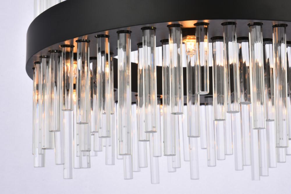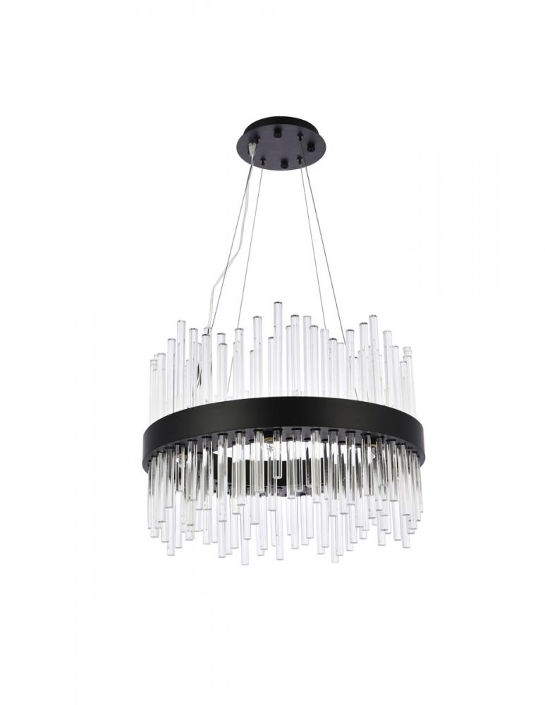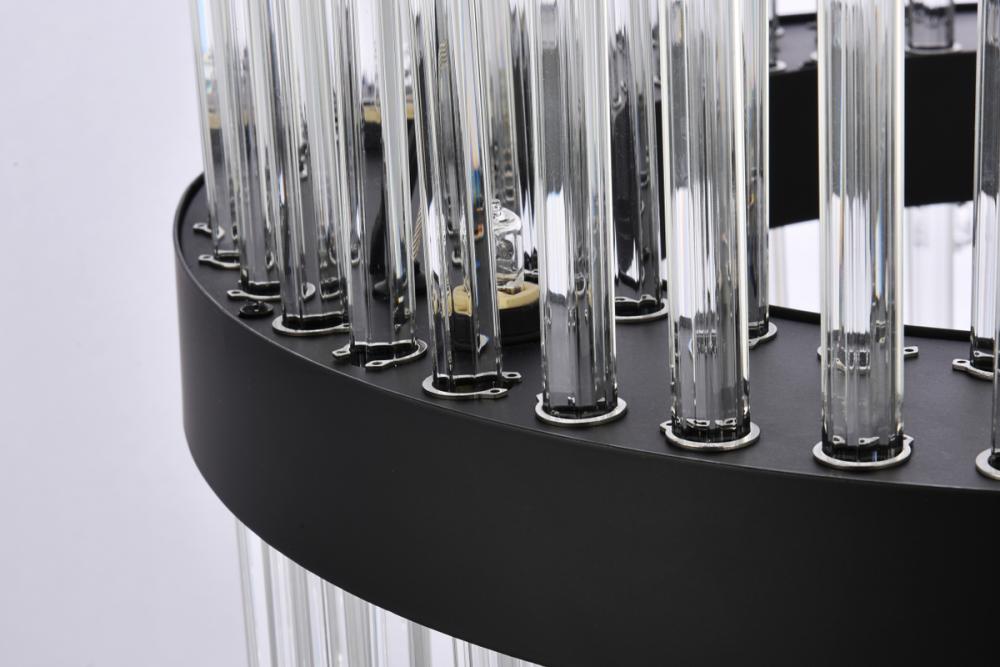 This stately fixture combines timeless elegance with modern and attractive sophistication. The delicate juxtaposition of upright and hanging clear glass rods creates a truly stunning visual statement, seamlessly woven together within a sleek bold metal frame. This expressive piece would be a welcomed and treasured addition to a wide range of modern residential styles.