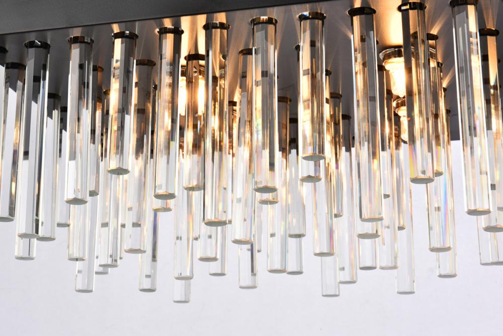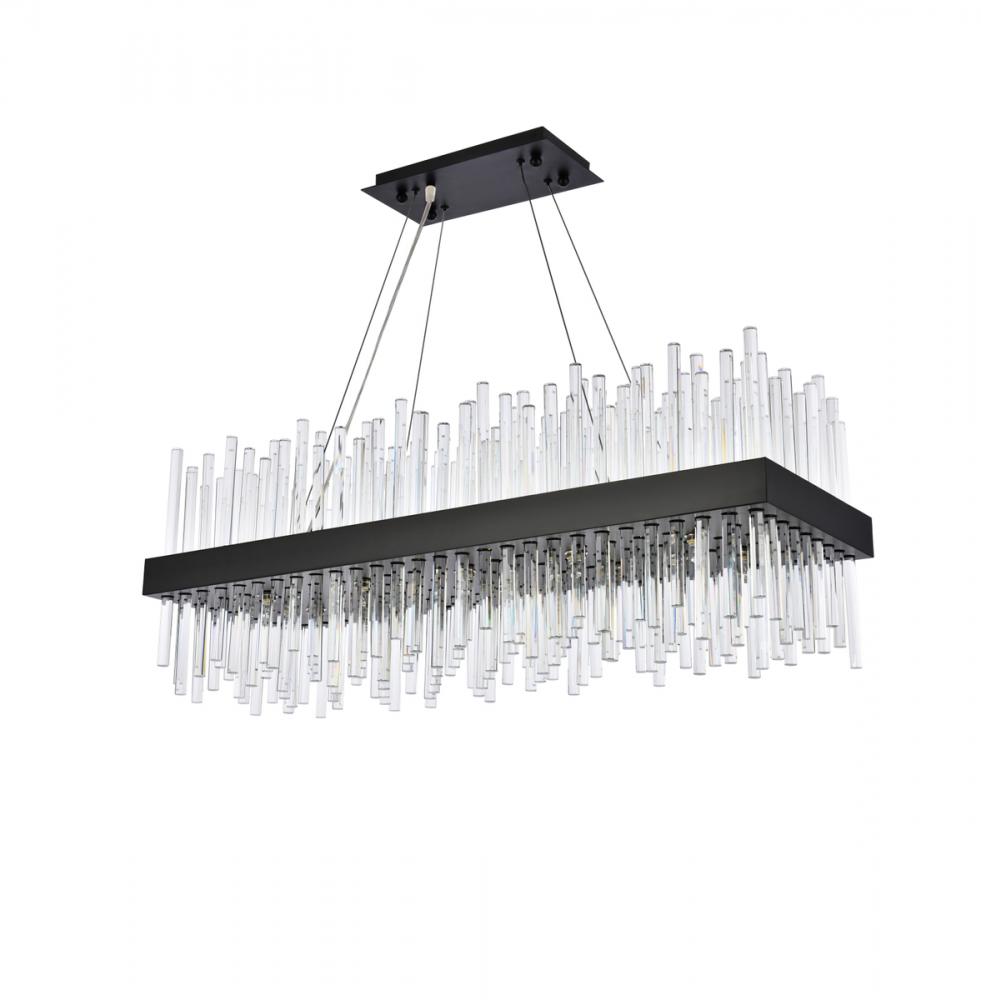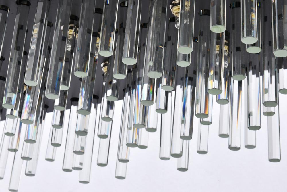 This stately fixture combines timeless elegance with modern and attractive sophistication. The delicate juxtaposition of upright and hanging clear glass rods creates a truly stunning visual statement, seamlessly woven together within a sleek bold metal frame. This expressive piece would be a welcomed and treasured addition to a wide range of modern residential styles.