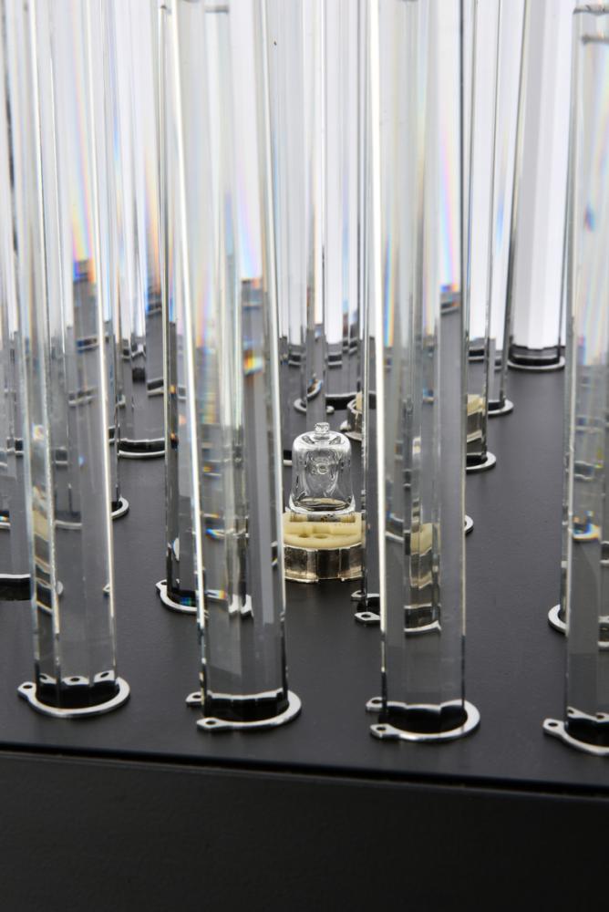 Rows of clear staggered glass rods embedded into the thick iron frame