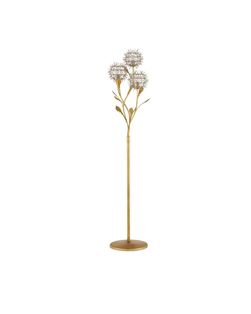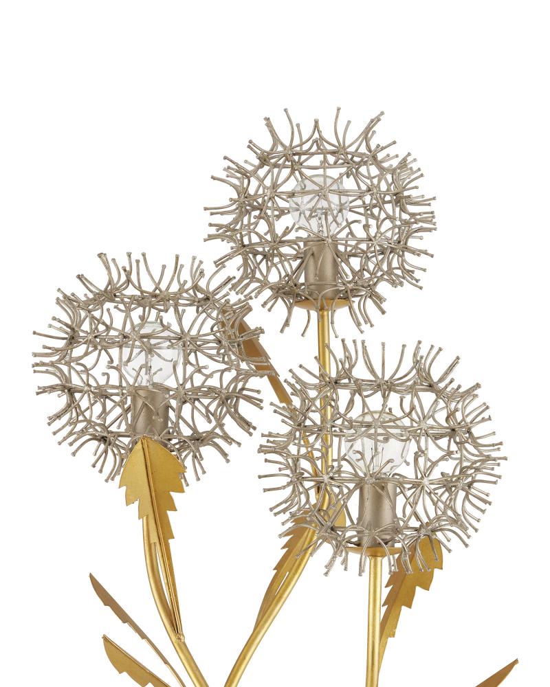 The Dandelion Silver & Gold Floor Lamp is a masterful composition that celebrates its namesake flower. The puff-balls that surround the bulbs are made of nails that are bent and welded together, a process that is extremely labor intensive. Made of wrought iron, the lamp's base, stems, and leaves are in a contemporary gold leaf finish, while the floral elements are in a mix of contemporary silver leaf and contemporary silver finishes. This special piece expressively celebrates nature.