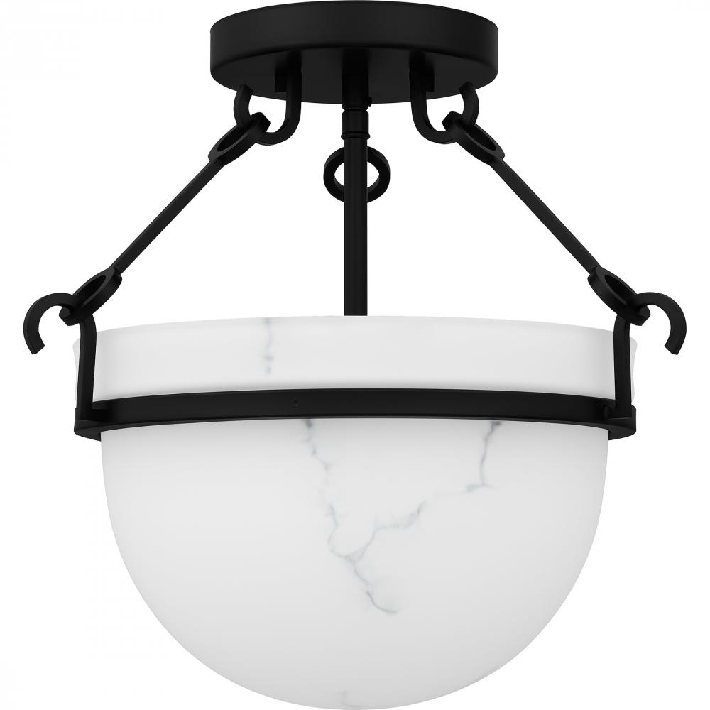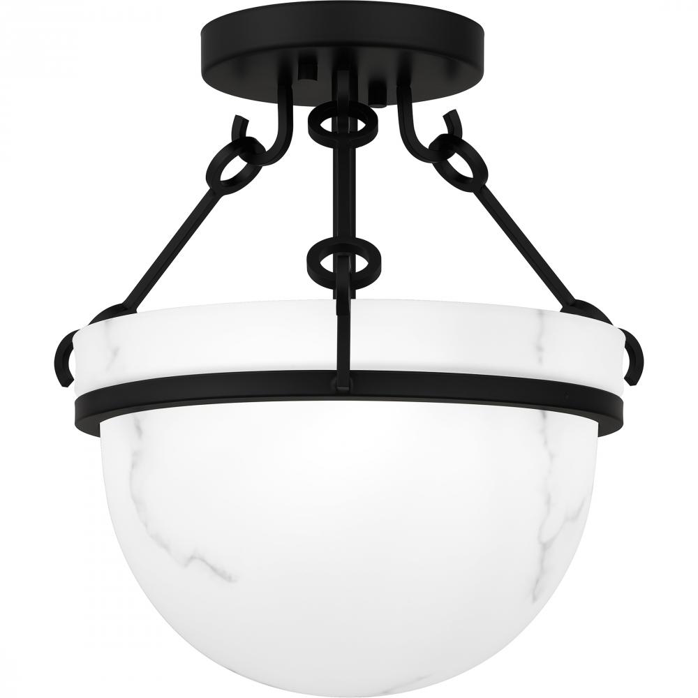 The transitional styling of the Danyon semi-flush mount is simple with an elegant flourish. A classic silhouette finished in matte black combines with an alabaster glass shade for a beautiful pairing. This versatile piece makes a perfect choice in any hall