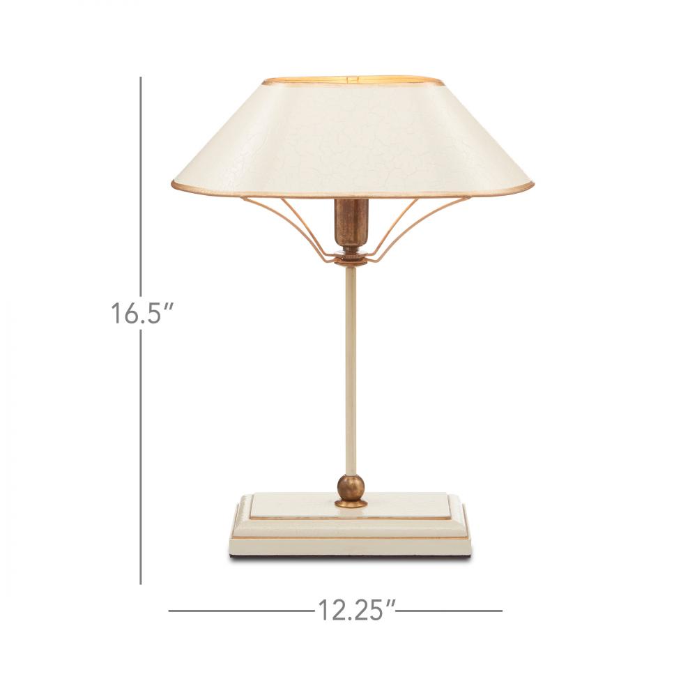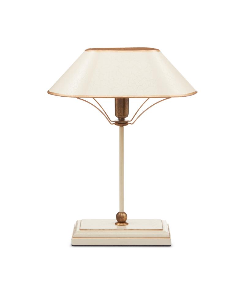 The Daphne Table Lamp looks as if it is made of one material in three distinctive finishes but the base is made of wood while the other elements on the ivory table lamp are made of wrought iron and brass in antique brass and gold finishes. The shape of the oval shade with its painted trim is a design detail worth noting.