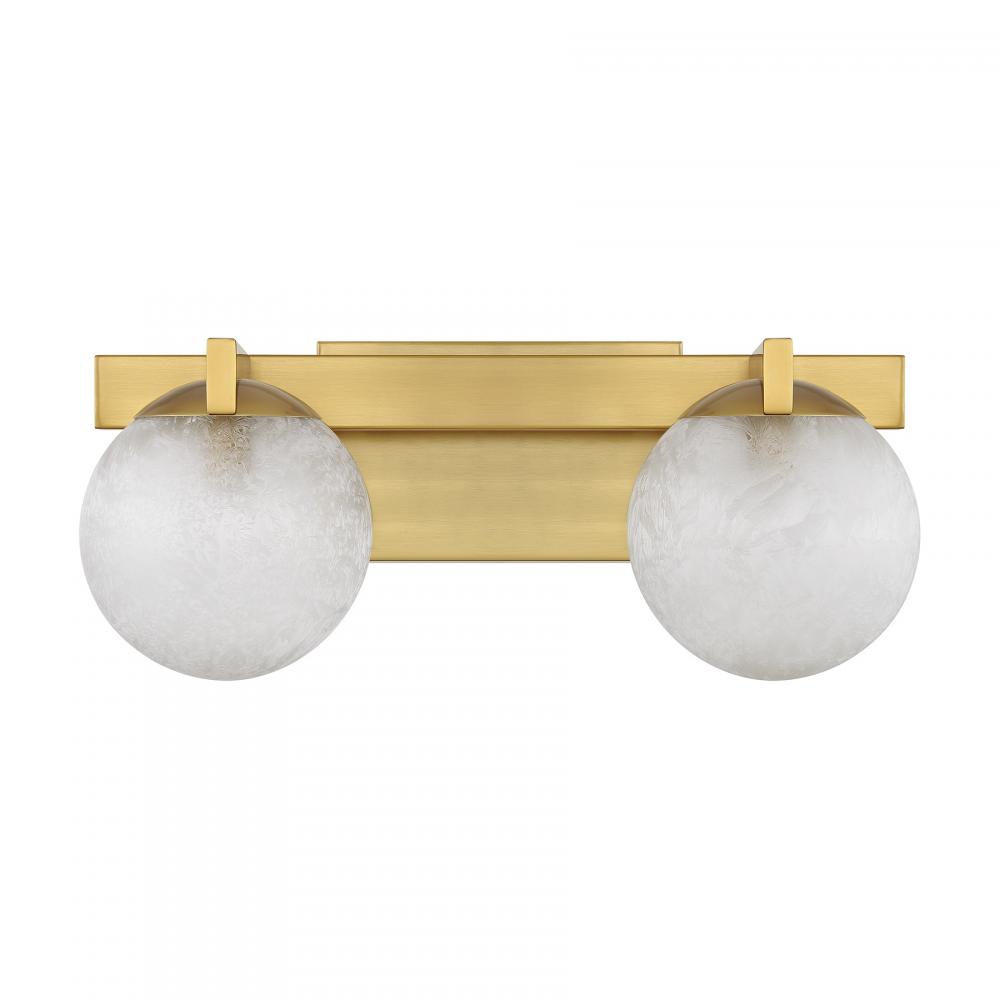 The Savoy House Darien is a 2-light bath bar with fabulously chilly appeal. A minimal frame is finished in bold Warm Brass and holds two orbs of Ice Glass, adding sub-zero cool with tons of frosty texture. Darien is 7.25" in height, 17" in width and extends 7.25" from the wall. Uses two candelabra size bulbs of up to 60 watts per bulb. Bulbs not included. This bath bar is damp area rated.