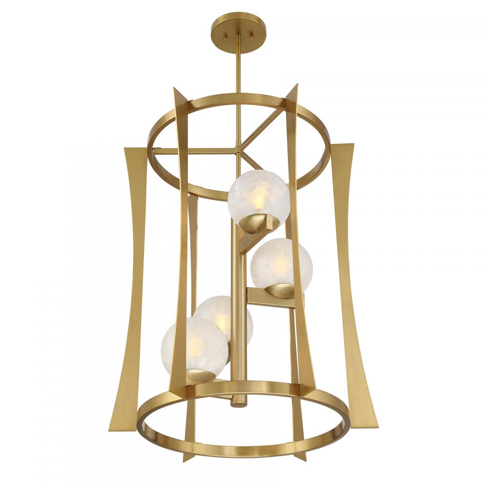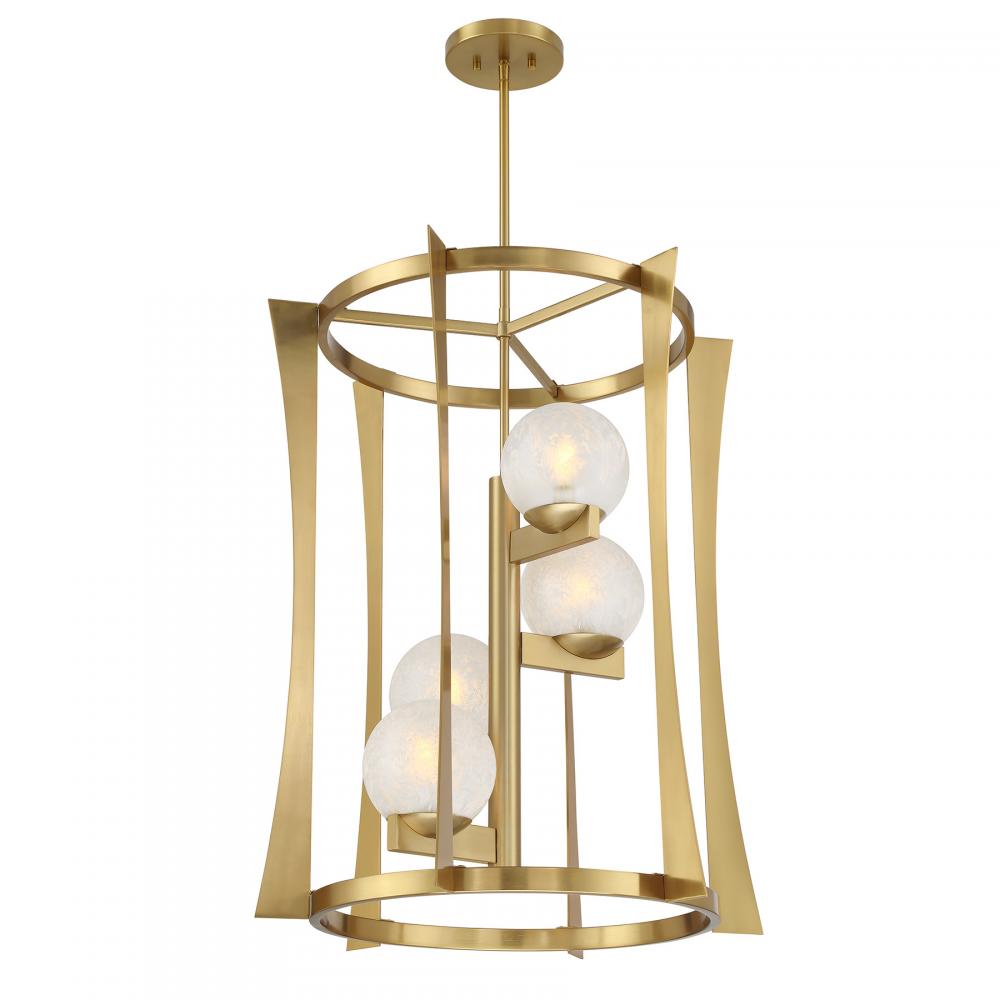 The Savoy House Darien is a 4-light foyer light with fabulously chilly appeal. A minimal, structural frame is finished in bold Warm Brass and holds four orbs of Ice Glass as if they are on a spiral staircase, adding sub-zero cool with tons of frosty texture. Darien is 23" in width and has an adjustable height ranging from 30" to 84". Uses four candelabra size bulbs of up to 60 watts per bulb. Bulbs not included. Comes with four 12" downrods and one 6" downrod.
