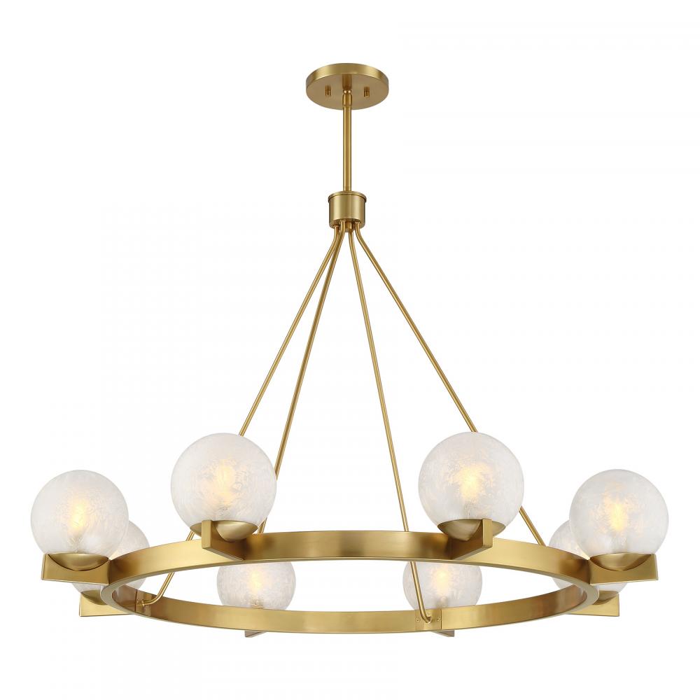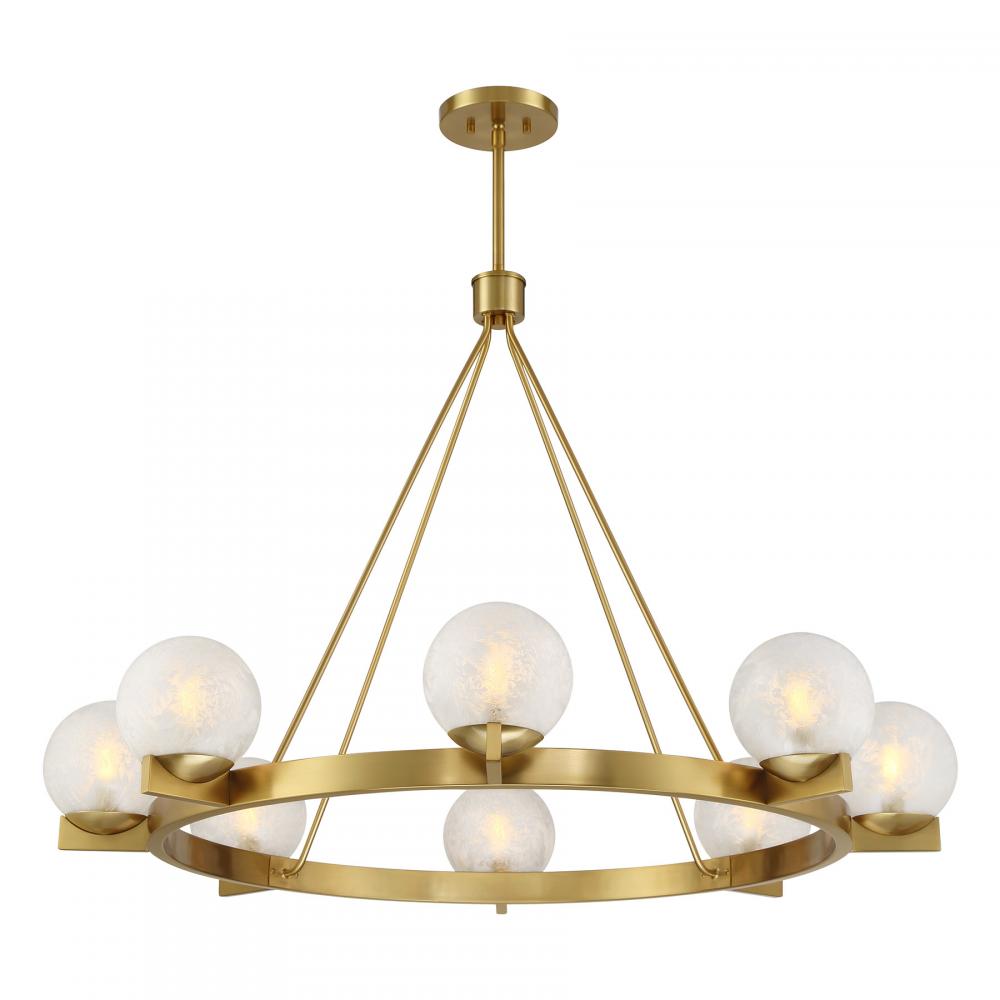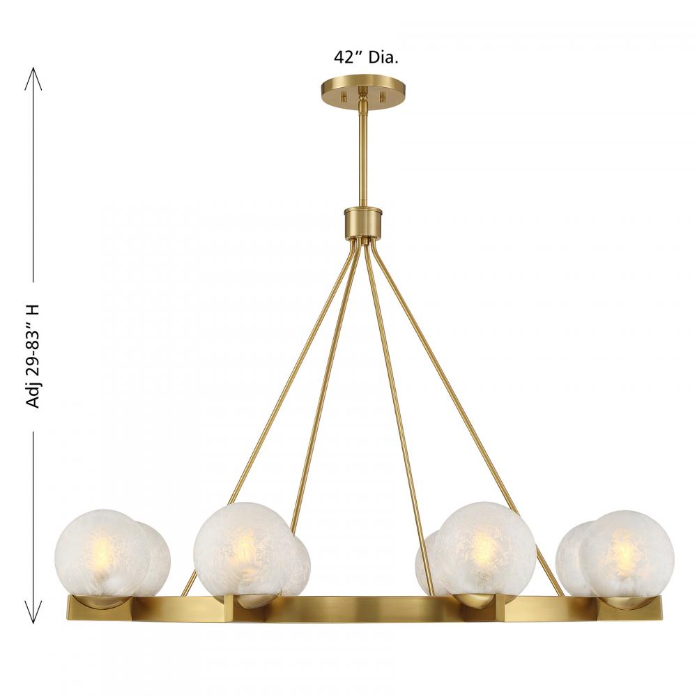 The Savoy House Darien is a 8-light chandelier with fabulously chilly appeal. A minimal, circular frame is finished in bold Warm Brass and holds eight orbs of Ice Glass, adding sub-zero cool with tons of frosty texture. Darien is 42" in width and has an adjustable height ranging from 29" to 83". Uses eight candelabra size bulbs of up to 60 watts per bulb. Bulbs not included. Comes with four 12" downrods and one 6" downrod.