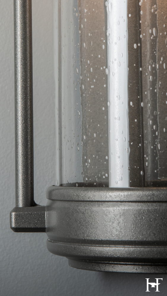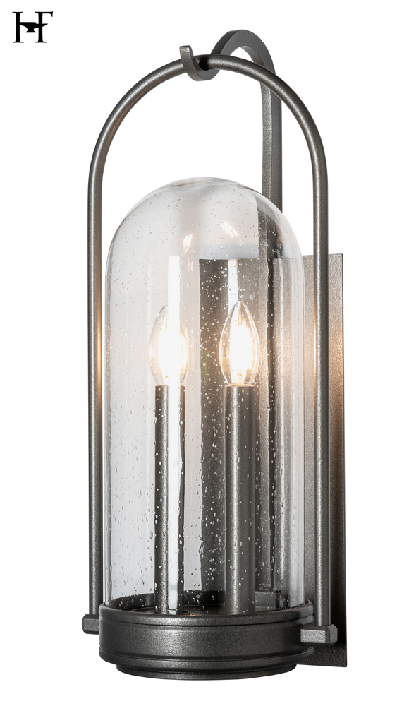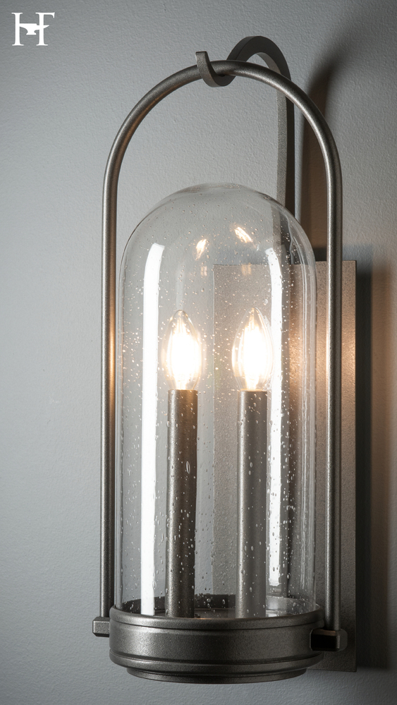 A fresh interpretation of a traditional, hook-style exterior wall mounted fixture, the Davis features a clear, seeded glass bell, exposing two "candlesticks" within. An aluminum backplate serves as the backdrop for this beautifully designed sconce. Available in a choice of AAMA 2604-rated Coastal Outdoor Finishes.