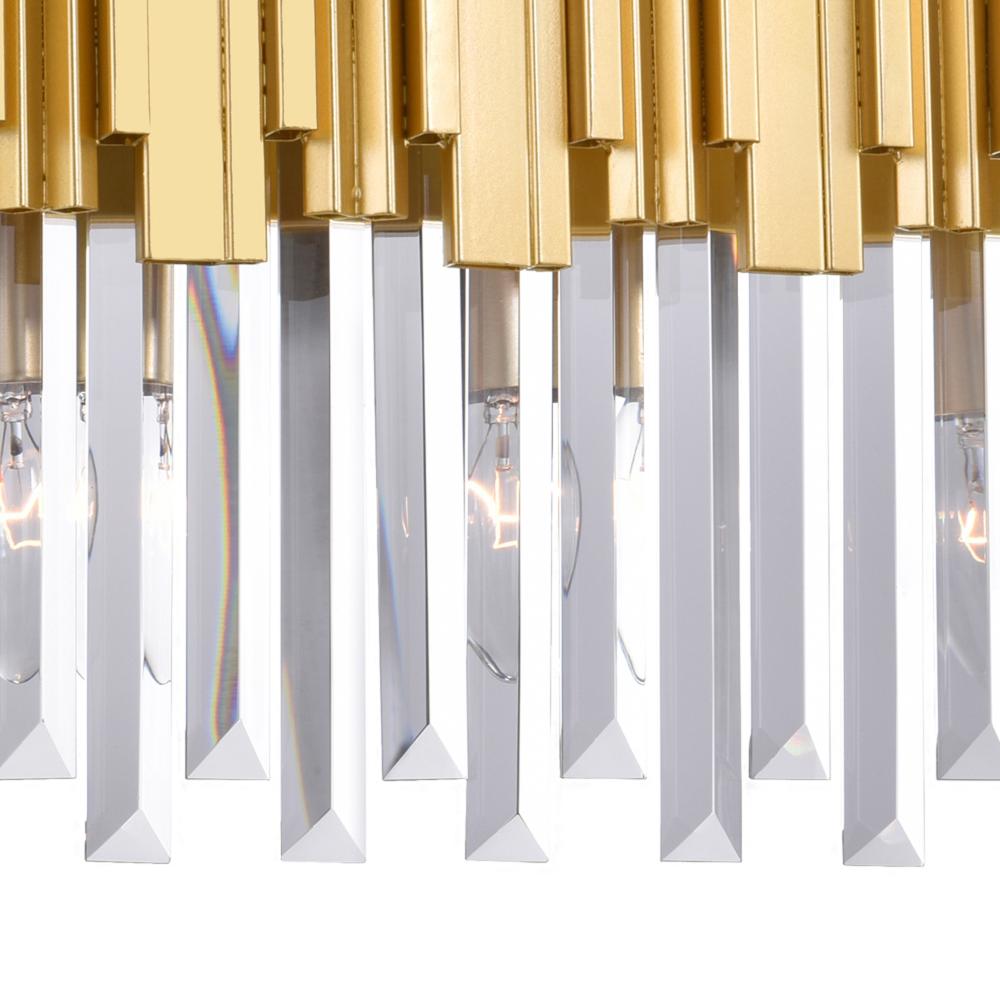 The dazzling shine of Deco 3 Light Wall Sconce is unmistakable. This vanity light features a horizontal frame of slender vertical bars finished in medallion gold. Dropping from the bottom of the gold frame are clear crystal prisms. Three candelabra-based b