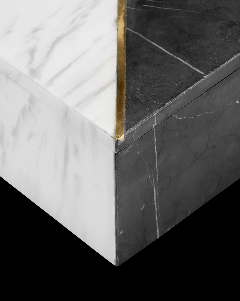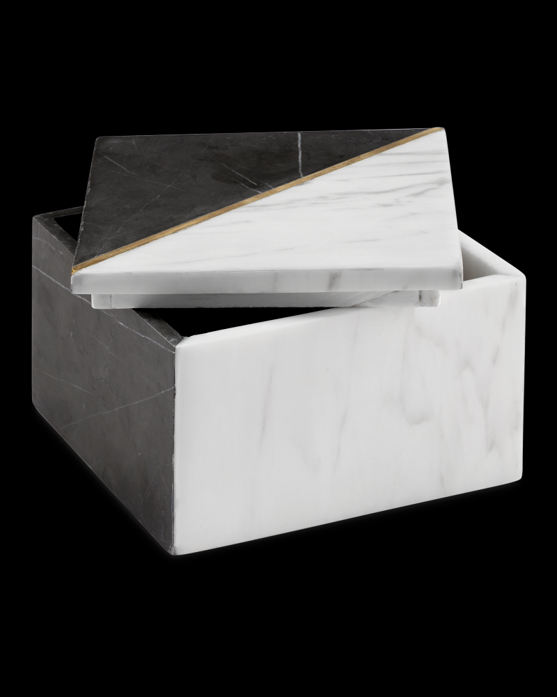 The Deena Black & White Marble Box is geometrically sophisticated. The white and pietra gray marble are juxtaposed against each other in a dynamic way: the two dark sides are topped with a triangle in the same color, and it is the same with the white. Slicing through the middle of the top to separate the two is a brass inlay on slant. The solid marble black and white decorative box has mitered joints and a composite coating on the bottom to keep it from scratching surfaces.