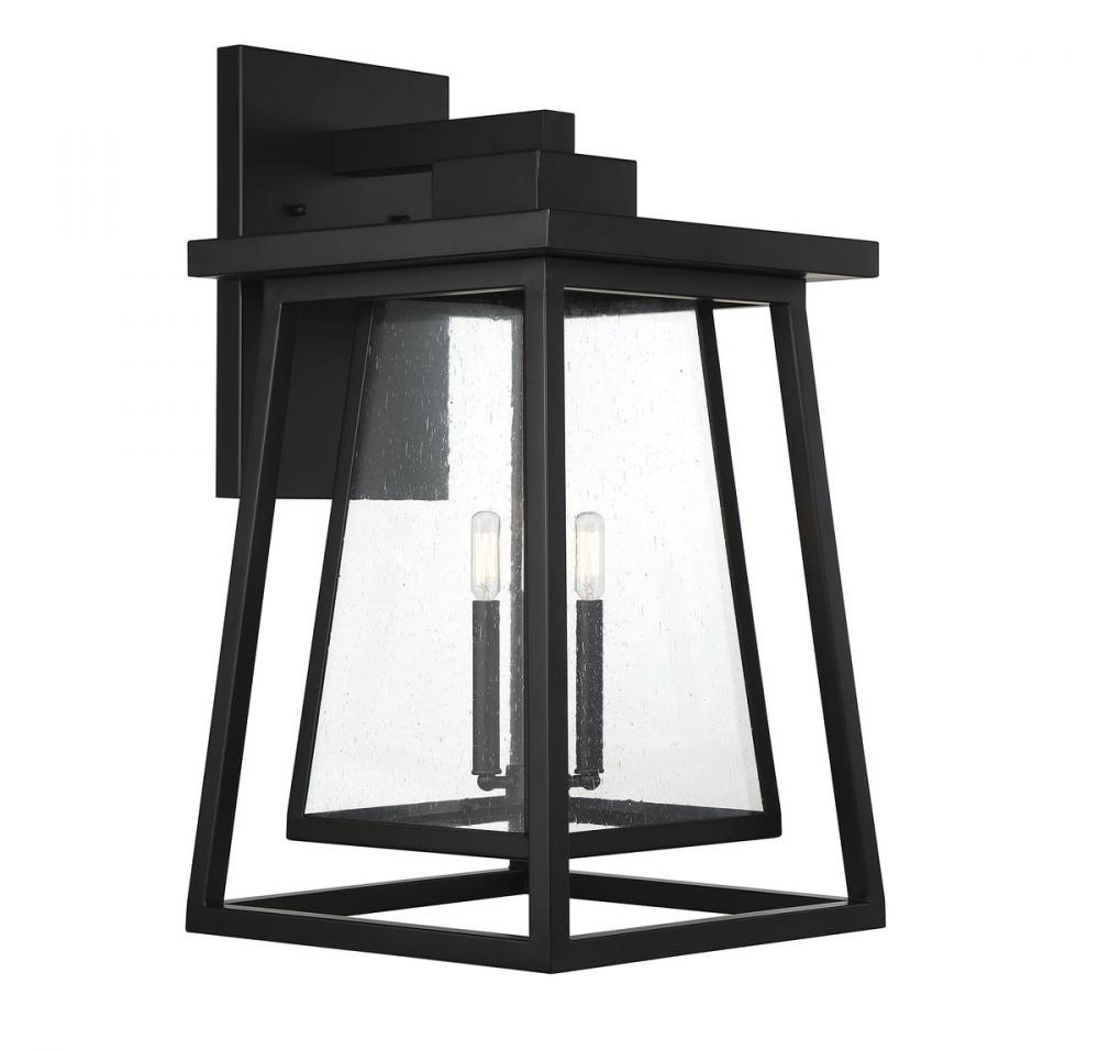 Boost your curb appeal and create a great first impression with the Craftsman-inspired style of the Savoy House Denver 3-light outdoor wall lantern. Clear seedy glass and a matte black finish make Denver a great choice for lighting up today's fashionable homes. This fixture is 29" in height, 16" in width and extends 17" from the wall. It uses three candelabra size bulbs with a max of 60 watts per bulb. Wet area rated.