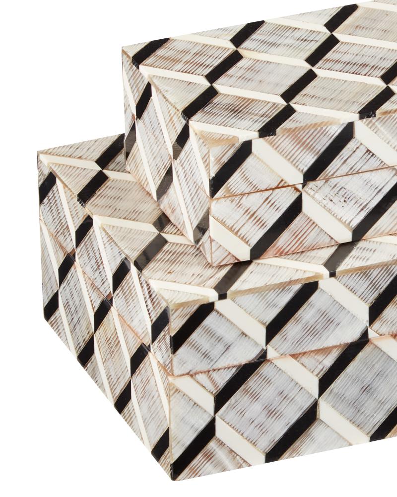 Mixing chiseled horn with composite brings the Derian Box Set a nice luminous texture. The striations on the surfaces of the pair of decorative boxes, which nest inside each other, are achieved when artisans take chisels and put them on angle as they are hammering the lines into the surface of the horn. The black and white diamond shapes are clean, contrasting elements.