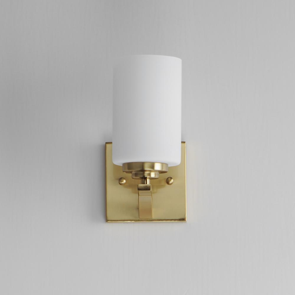 Low sloping arms of rectilinear tubing is finished in a variety of options that include Satin Nickel, Oil Rubbed Bronze, Matte Black, and a contemporary Satin Brass finish. Tall, cylindrical Satin White glass shades soften the light source within. Offered