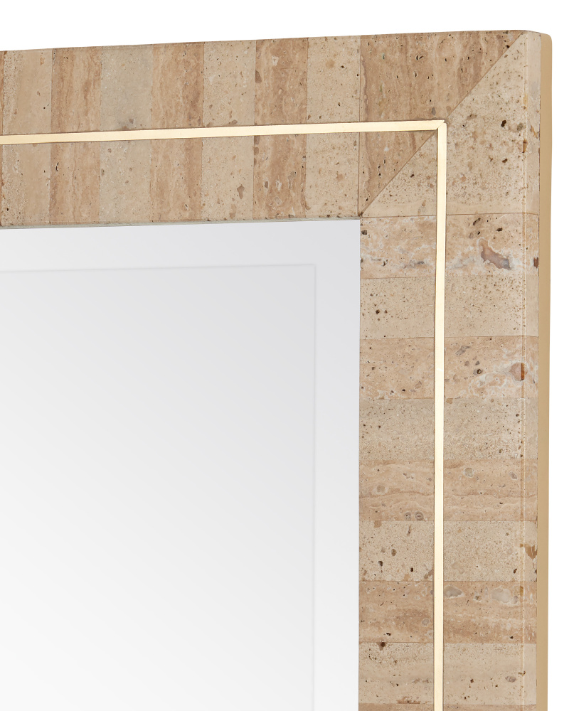 The Dezi Rectangular Mirror is made of natural travertine tiles arranged in a stacked dark-and-light pattern with a brass inlay running through the cente. The effect of the intermingling of materials is a pop of brightness as the natural light hits the metal and a hint of warmth as the stone absorbs it. The surfaces of each decorative mirror will be slightly different given the natural material from which they are made.