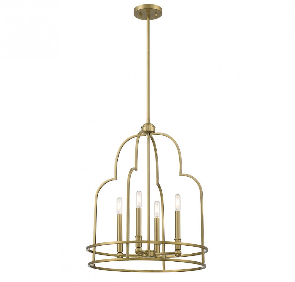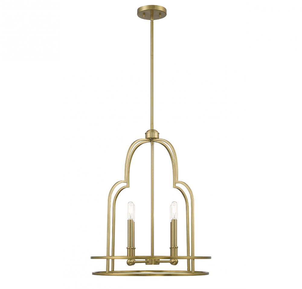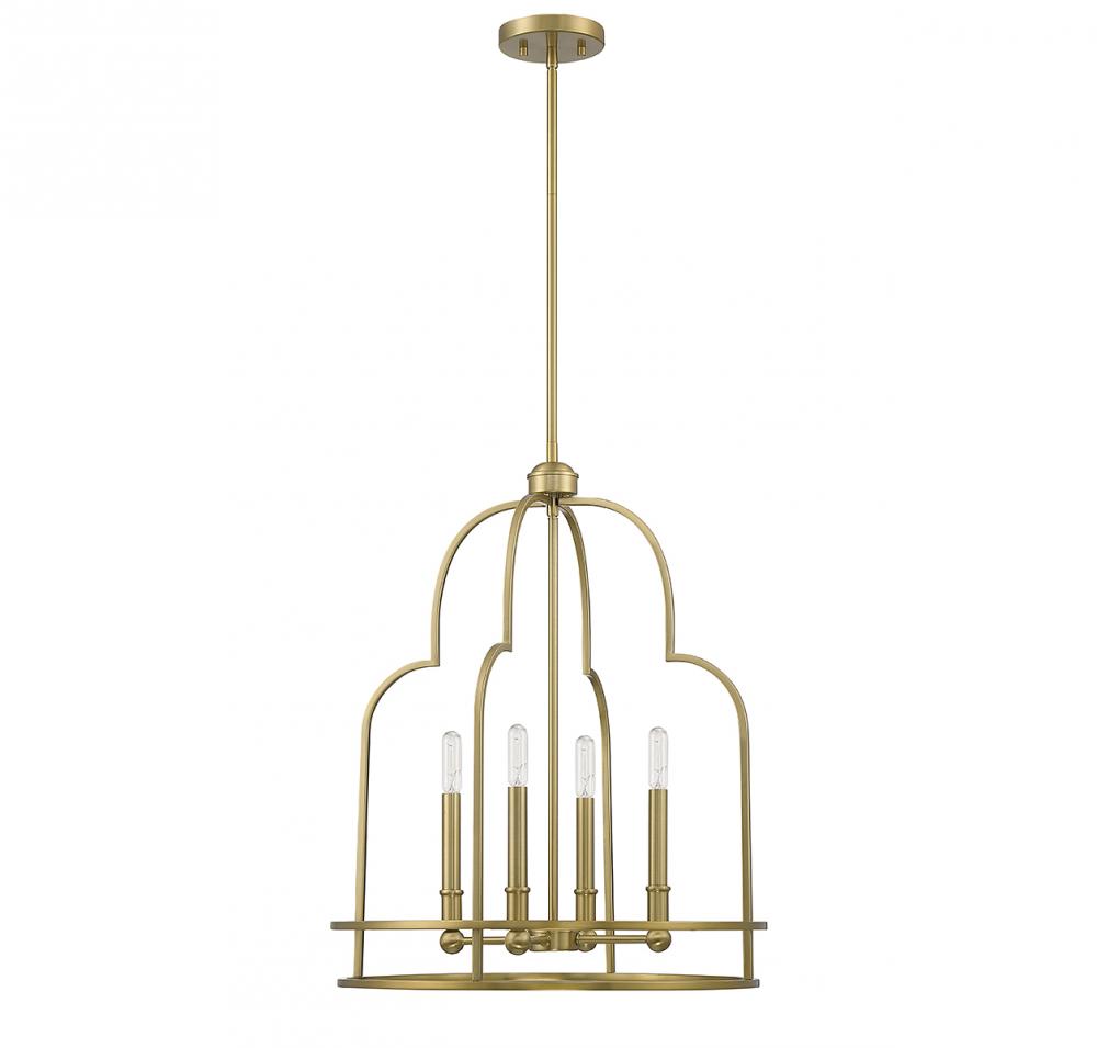 The eye-catching curves on the Savoy House Diplomat 4-light pendant make it an intriguing lighting choice for any space, especially for creating great first impressions in foyers and entryways! Finished in warm brass. Diplomat is 20" in width and has an adjustable height ranging from 25.5" to 79". Comes with four 12" downrods and one 6" downrod. It uses 4 candelabra size bulbs of up to 60 watts per bulb (bulbs not included).