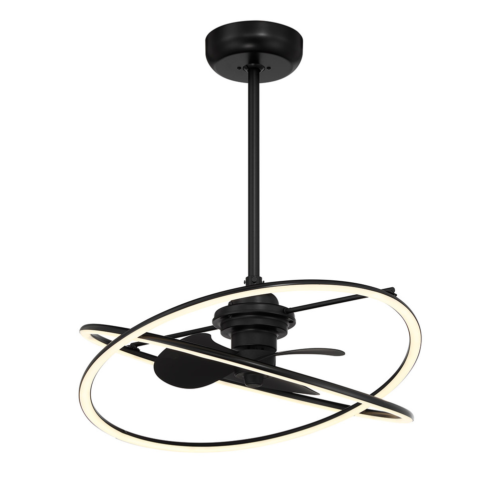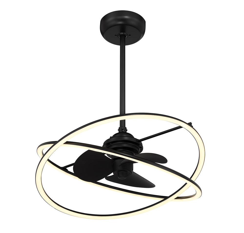 Cool and cutting-edge, the Savoy House Dorado Fan D'Lier reinvents the chandelier and the ceiling fan in one fabulously fashionable fixture. Bands of integrated LED light encircle the fan, which is finished in Matte Black. Dorado uses an efficient DC motor and has a handheld remote control for extra convenience. It is 25" in width and 10.5" in height. Comes with a 4" downrod and an 18" downrod. Fan D'Liers are a Savoy House exclusive. These custom designs are inspired by high-end designer styles and take top trends to a whole new level.