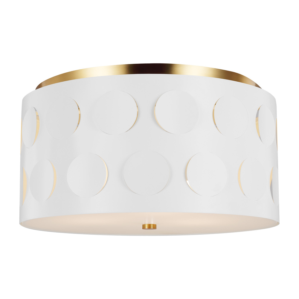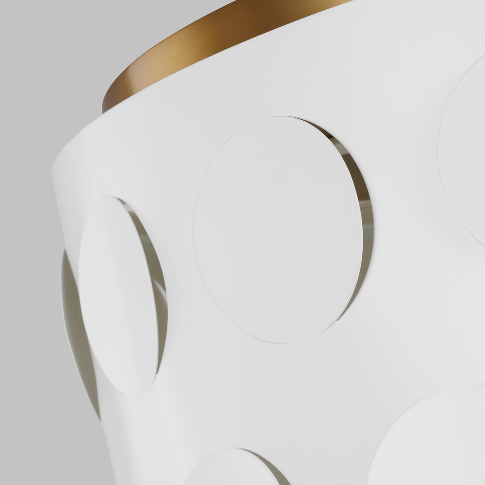 A cheerful, modern take on the classic flush mount, this fixture is crafted of steel and a matte white motif design with burnished brass accents.