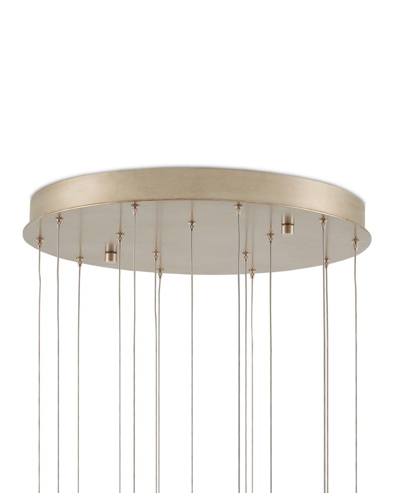 The Dove Round 15-Light Multi-Drop Pendant has pleated shades made of pale ceramic that diffuse the light wafting through them. The indentions and ridges on the shades of the white pendant bring a textural feel to this luminary even though it is monochromatic. The canopy of this piece is luminous in a painted silver finish. This fixture is among Currey & Company's multi-drop pendant collection, which includes multiple configurations.