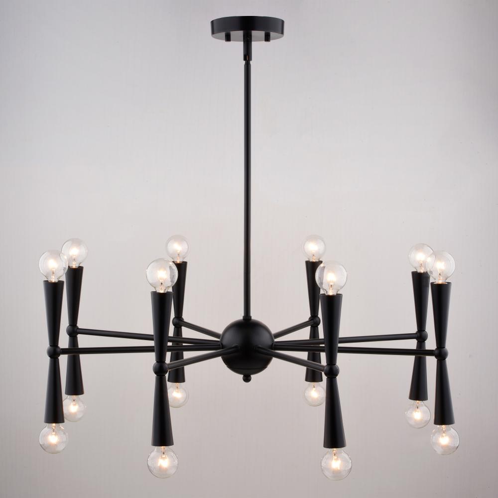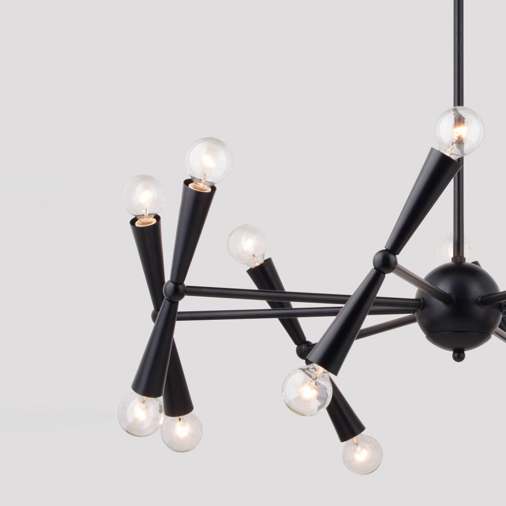 The Drake 29-in. chandelier is a playful homage to mid-century modern design. Rotating outer arms for customizable ambiance with its 16 lights and the striking matte black finish completes the overall look. Perfect for dining rooms, living spaces, bedrooms or home offices seeking a touch of retro-chic charm.