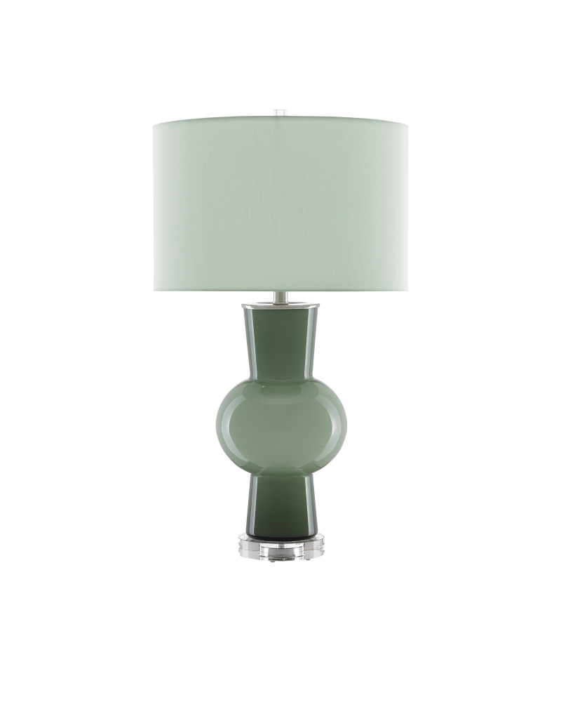 The Duende Green Table Lamp is made of glass with an artful light and dark green surface. The clear optic crystal base anchors the composition that is topped with a green lily shantung shade.
