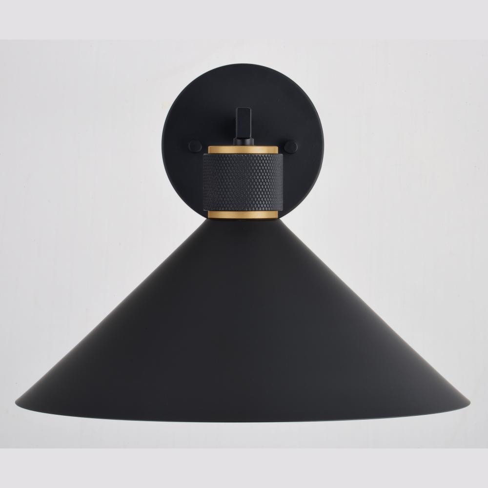 The combination of matte black and gold finishes brings contemporary style to the Dunbar collection. A tapered metal shade provides downward dark sky lighting and features a textured knurled ring accent. Ideal for use on outdoor patios, entryways, and garages. Equally suited for indoor use such as the bath, hallway, or kitchen spaces.