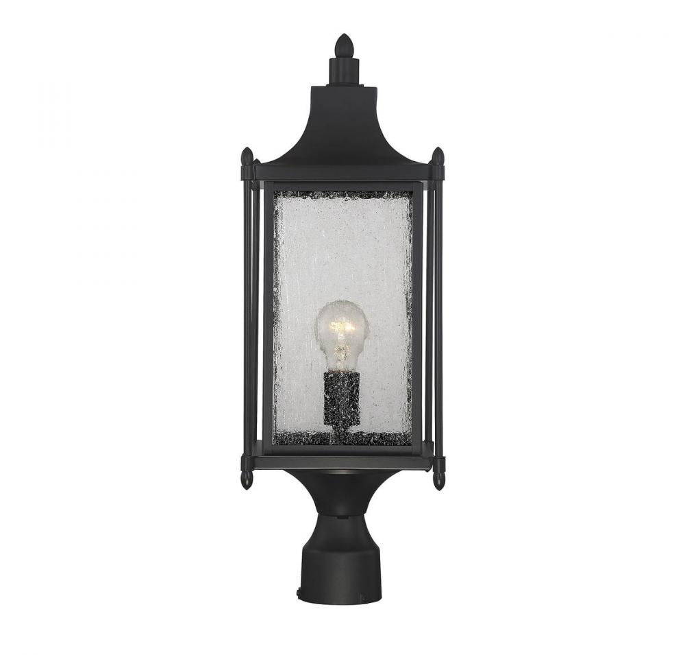 Featuring a design that is classic Americana, this Savoy House Dunnmore 1-light outdoor post light adds timeless elegance to the outdoor areas of your home. A high quality black finish blends incredibly well with many other hardware types and architectural materials. The traditional box shape is enhanced with slim outer columns, delightful finials and a graceful curved mansard roof. Panes of beautiful clear seeded glass add to the vintage charm and this wall lantern holds one 60W standard size bulb for ample, safe and welcoming illumination. It’s 8" wide, 23.5" high and UL rated for wet locations, so it's perfect to give inviting, classic style to your porch, patio, sunroom, pergola or other walls of your outdoor living areas.