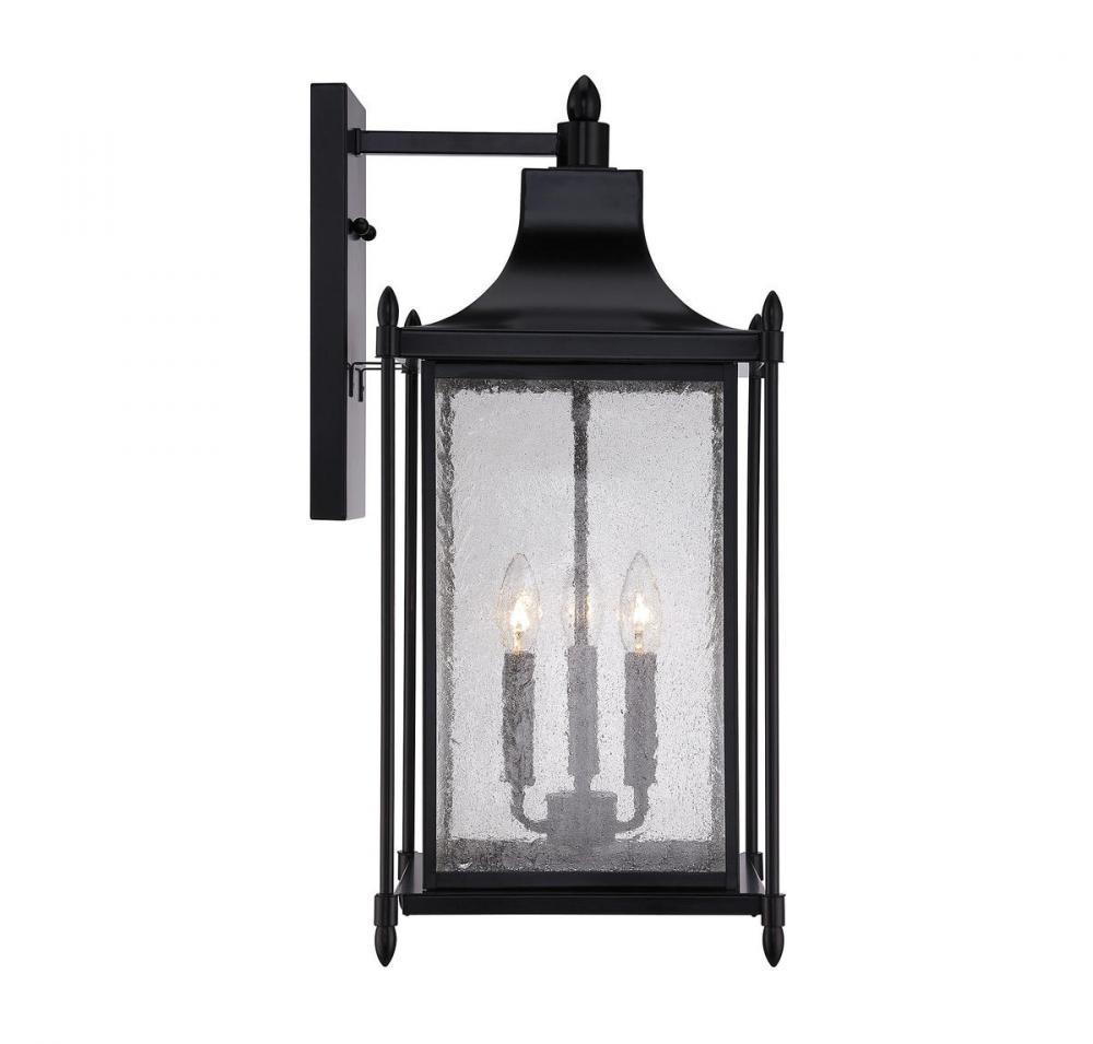Featuring a design that is classic Americana, this light fixture adds timeless elegance to the outdoor areas of your home. A high quality black finish blends incredibly well with many other hardware types and architectural materials. The traditional box shape is enhanced with slim outer columns, delightful finials, and a graceful, curved mansard roof. Panes of beautiful, clear, seeded glass add to the vintage charm. And this wall lantern holds three 40W, candle-style bulbs, for ample, safe, and welcoming illumination. It’s 11” wide, 23.5” high, and UL rated for wet locations — perfect to give inviting, classic style to your porch, patio, sunroom, pergola, or other walls of your outdoor living areas.