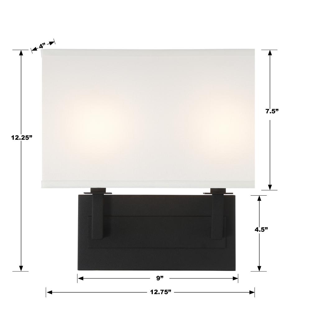 The Durham two-light wall mount features a rectangular base and crisp white silk shade. Perfect for a hallway, living room, and bedroom, this transitional accent is sleek and timeless, and easily added to any décor or space.