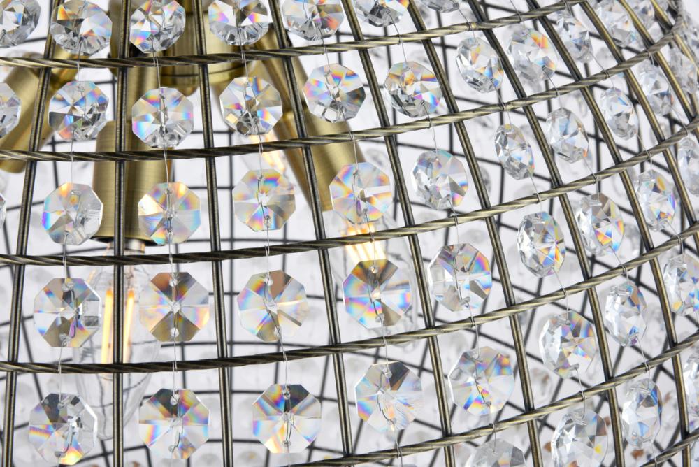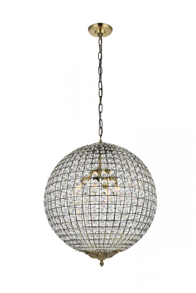 Brighten any room with this celestial globe of radiance, as overhead light bounces and dances off of hundreds of octagonal Crystal prisms. The beautiful spherical chandeliers of the Earlene collection are shaped by latitudinal and longitudinal metal ribs supporting the multifaceted ornaments, capped above and below with bases featuring delicate folds of antique bronze and a distinctive lower finial. The 20-inch-diameter fixture is brilliantly illuminated by four bulbs (not included).