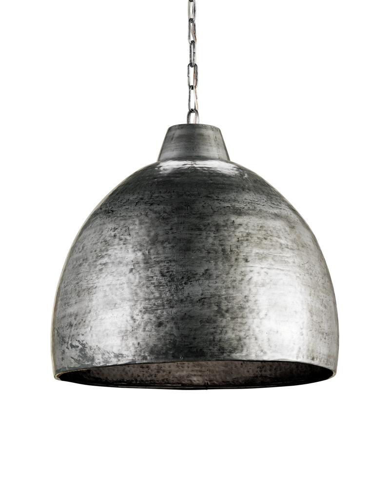 The Earthshine Steel Large Pendant has a hammered dome shape for a cool industrial look. Made of iron in a blackened steel finish, this sturdy silver pendant has a luminous glow on the interior. Adjustable from 28.5" to 95.5" with use of included chain/rod kit/cable. If your space calls for a longer drop, additional chain/rods/cable is available for purchase.